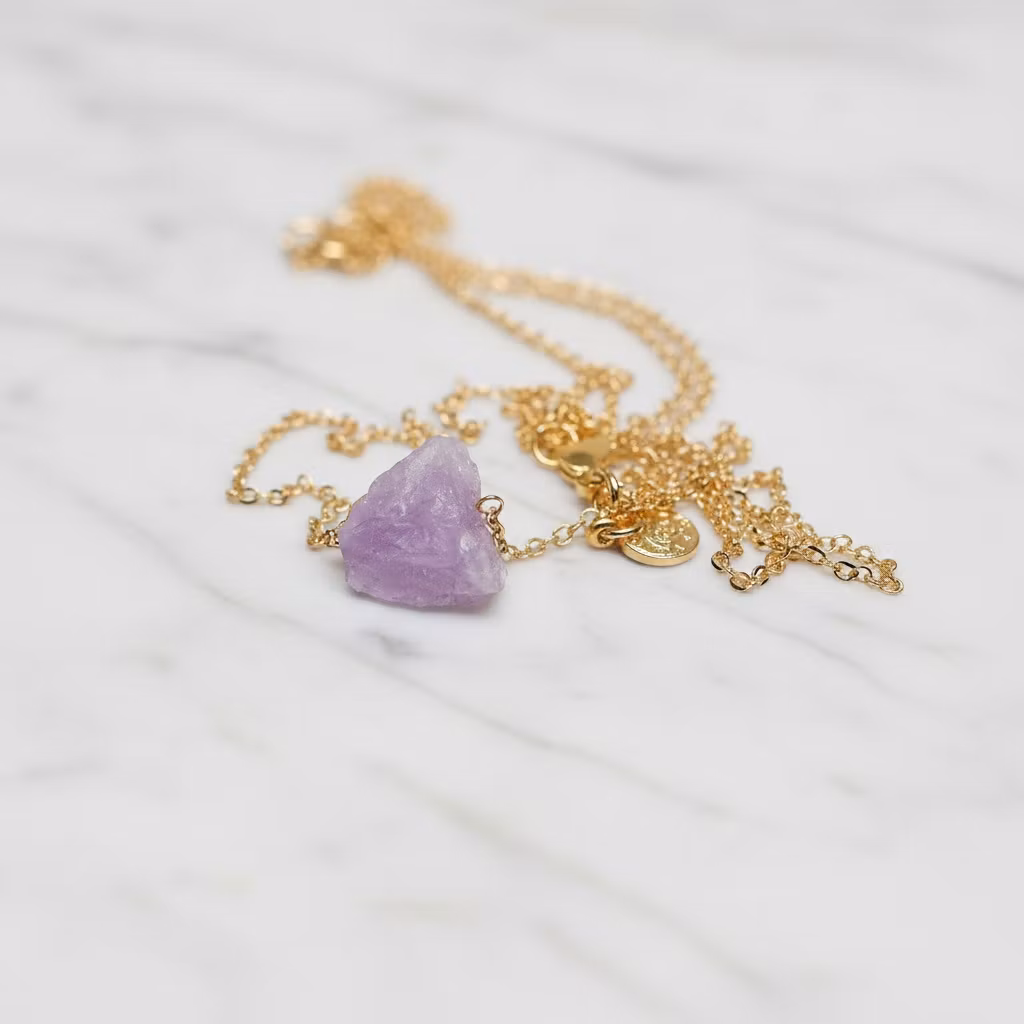 Kort guldpläterat halsband med smal ankarkedja, berlock och liten ljuslila rå ametist sten. Fint ametist halsband med grov ametist och liten rund berlock. Ametist stenen är äkta naturlig. Berlocken sitter i nacken vid låset på halsbandet. Då stenen är naturlig är alla ametister unika i form och mått. Månadsstenshalsband februari.