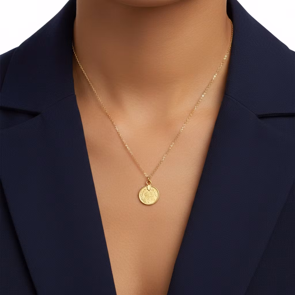 Guldpläterat halsband med smal fin ankarkedja och rund bricka i matt guld. Brickan är 18mm i diameter. Stilfullt halsband med bricka, perfekt för en lager på lager stil eller för att bära precis som det är.