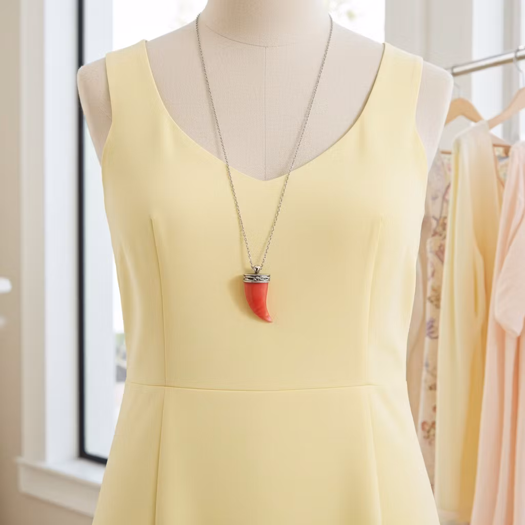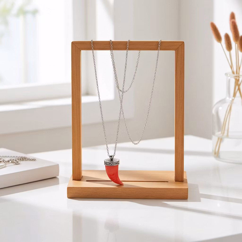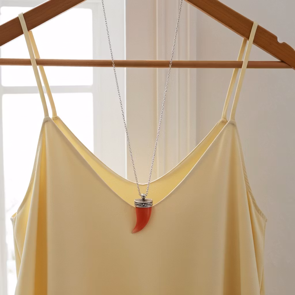 Silverpläterat halsband med lång halskedja och rosa körsbärskvarts kristall i form av en beta. Kristallen är ca 5,5cm lång. Körsbärskvartshalsbandet har en fin ankarkedja med stor rosa kristall. Stilfullt och trendigt kristall halsband med rosa körsbärskvarts.