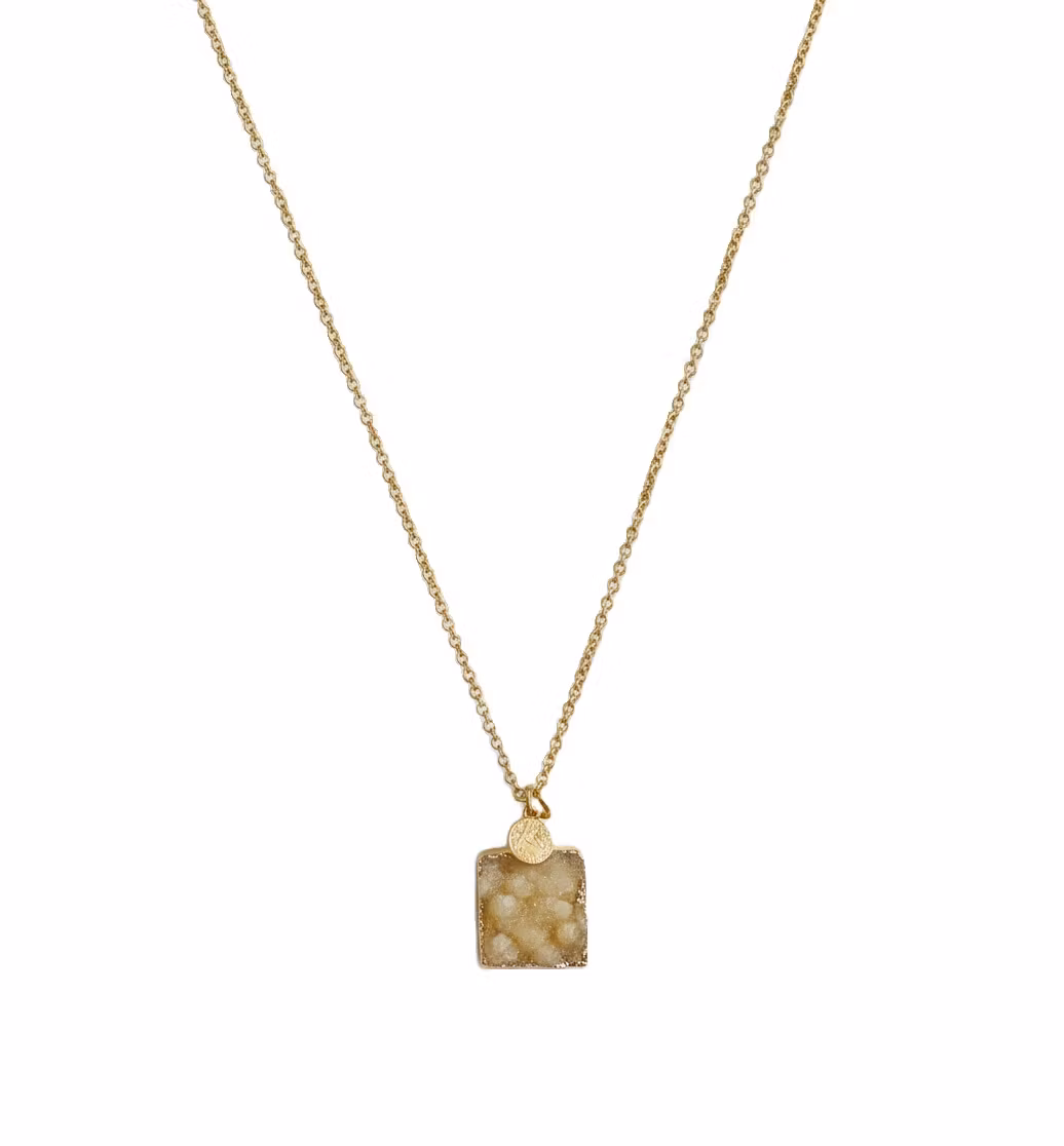 Guldförgyllt halsband med ärtlänkskedja och fyrkantig gul glittrande druzy agat sten. Stenen är 20mm i diameter. Vackert halsband med gul fyrkantig ädelsten och liten berlock. Stenen har en elektroplätering runt kanten. Kedjan och den lilla berlocken är i matt guld. Fint halsband som passar för alla tillfällen.