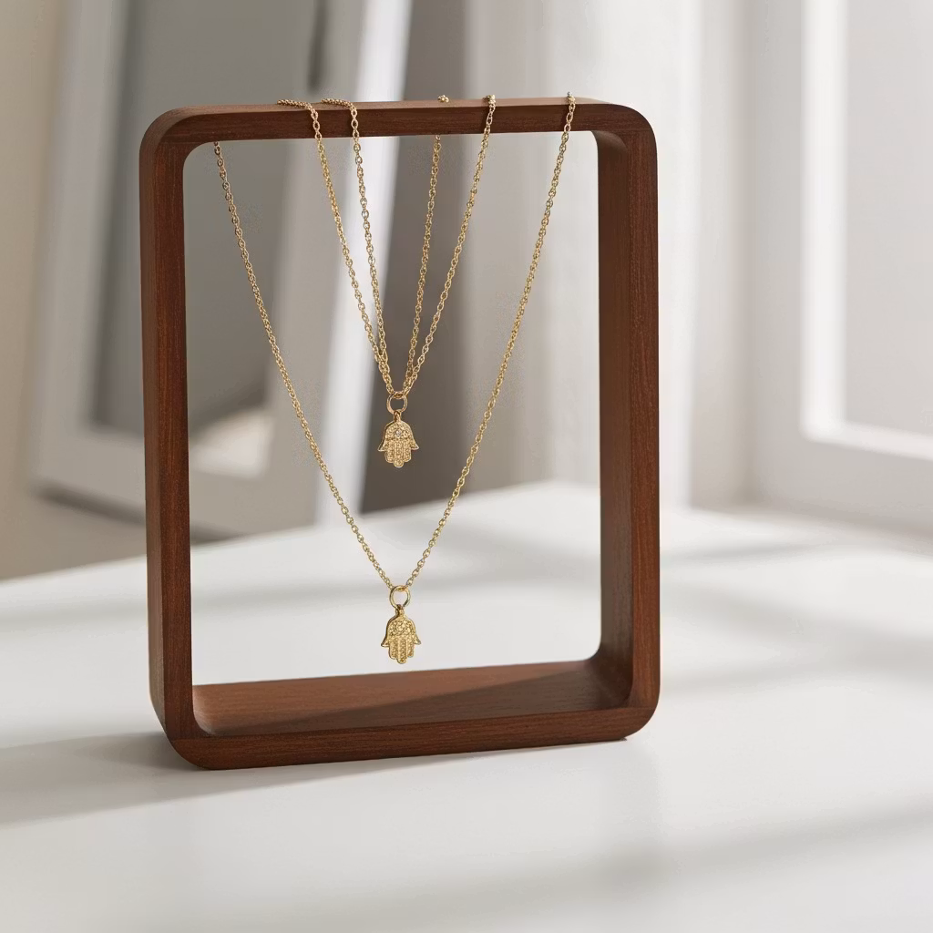 Guldpläterat halsband med smal kedja i fin kvalitet och liten detaljrik Hamsa hand, Fatimas hand. Hamsa handen anses vara en beskyddande symbol som sägs skydda sin bärare. Halsband med litet symbolhänge, perfekt för minimalisten eller för en lager på lager stil.