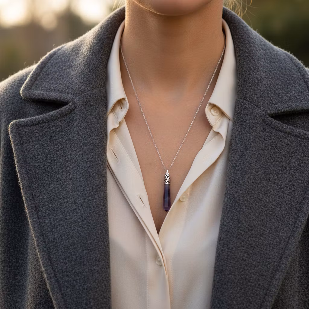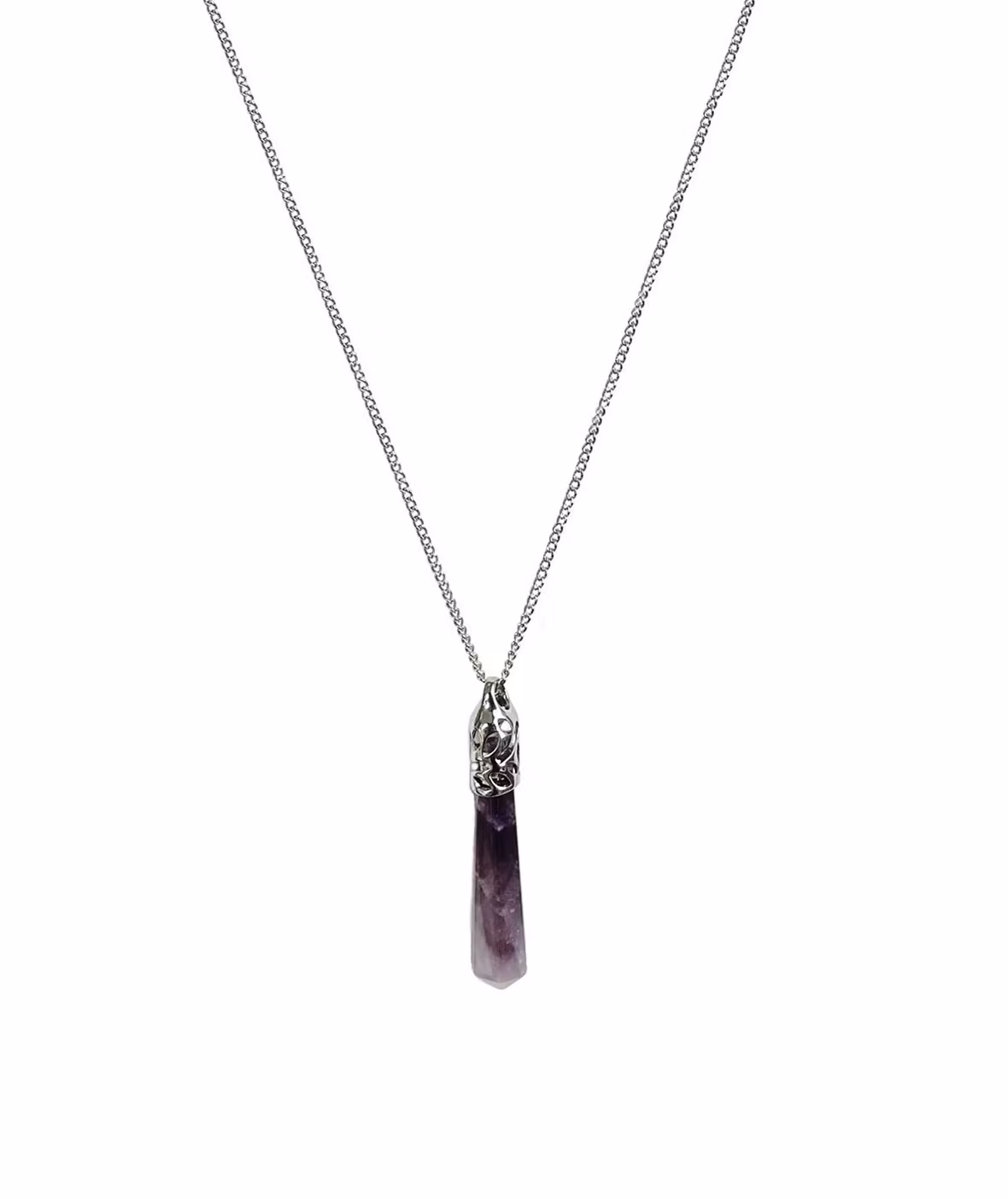 Långt silverpläterat halsband med smal pansarkedja och lila avlångt ametist hänge i form av en pendel. Pendeln är 7cm lång med fina detaljer. Stilfullt ametist halsband med fin lila ädelsten. Månadssten februari.