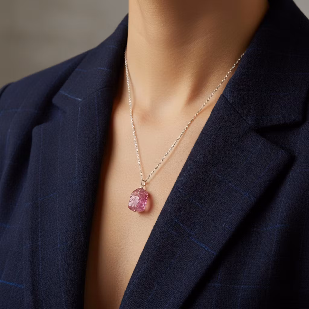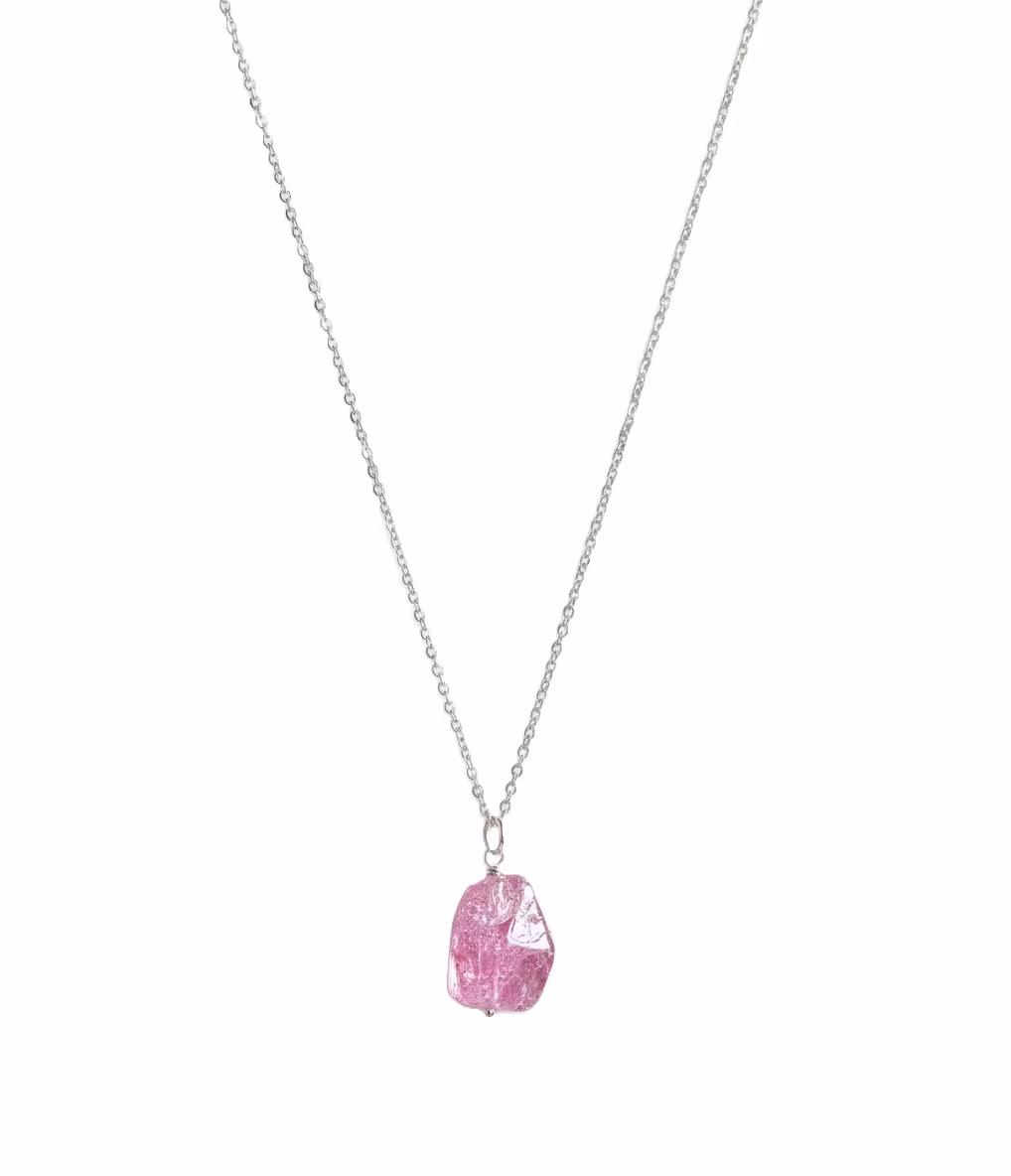 Silverpläterat halsband med rosa krackelerad bergskristall nugget med glansig polerad kristallyta. kristallen är från ca 15mm - 20mm lång och varje kristall är unik i form och mått. Rosa fint kristallhalsband med tjock kristall. Bergskristall är aprils månadssten, perfekt som gåva eller för dig själv.