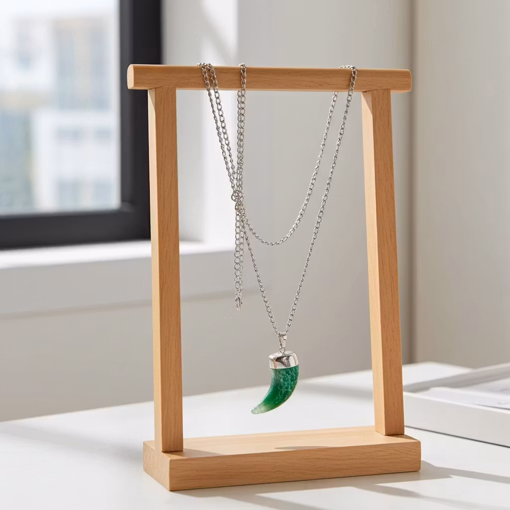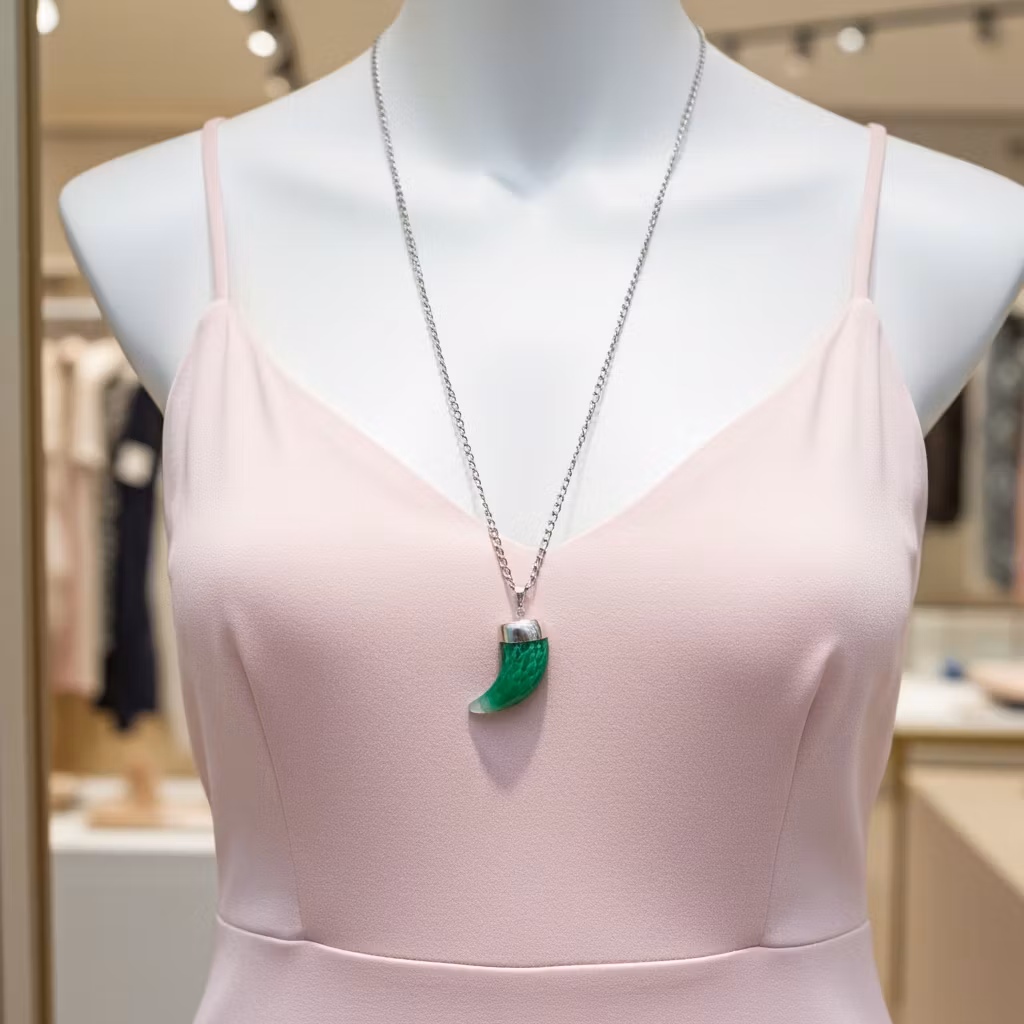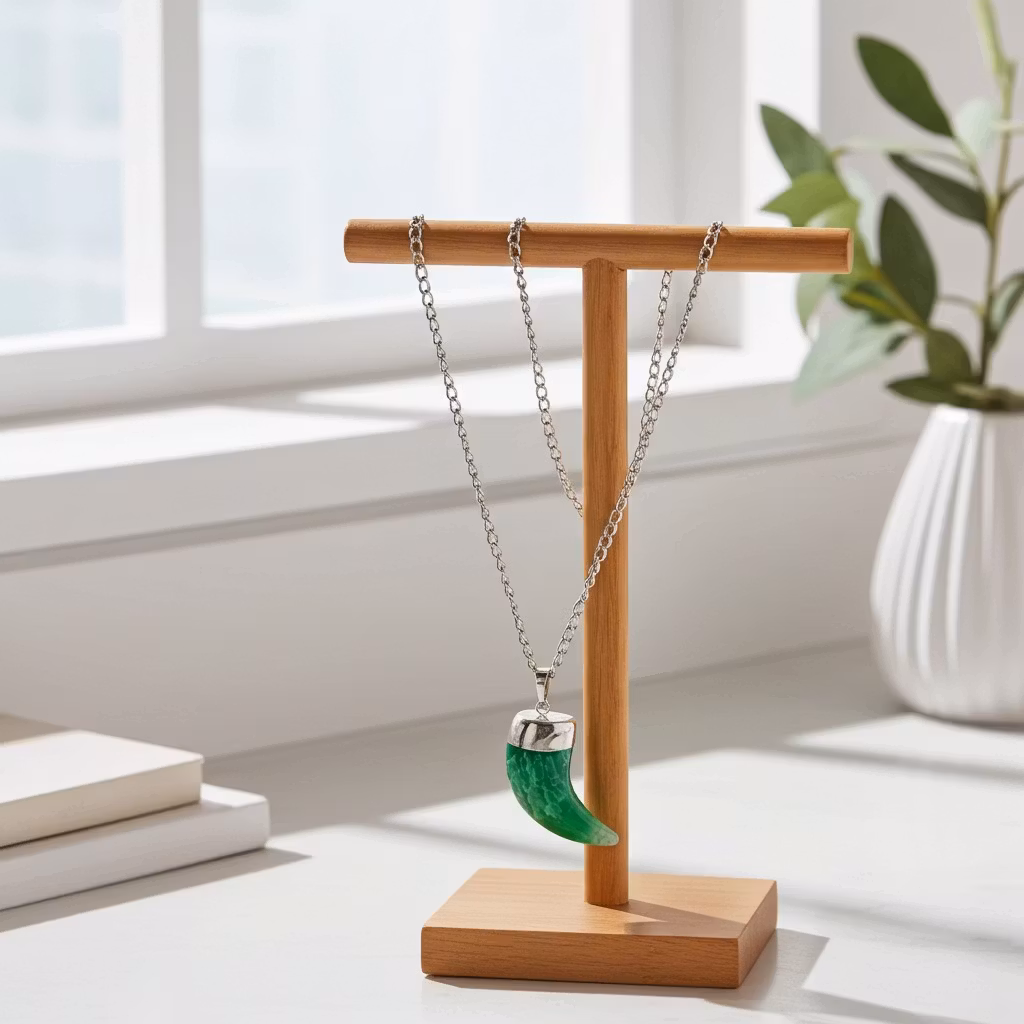 Halsband med stor grön ädelsten av agat med stor lång silverpläterad halskedja. Agatstenen är 6cm lång i form av en beta. Stilfullt och färgglatt halsband med grön ädelstensbeta av agatsten.