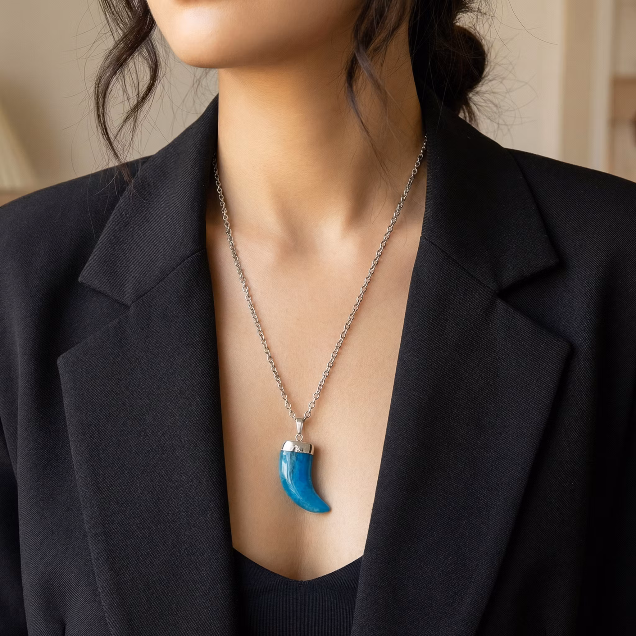 Silverpläterat halsband med stort blått tandhänge av ädelsten agat. Stenhänget är 6cm lång med stor halskedja. Trendigt och stilfullt halsband med stort ädelsten hänge. Välj mellan långt halsband och kort.