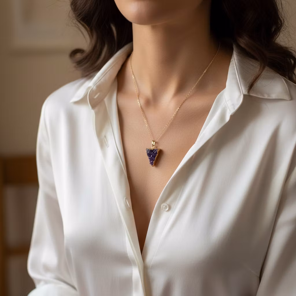 Guldpläterat halsband med smal fin ankarkedja och trekantig ametist sten i mycket fin kvalitet. Halsbandet har en vacker lila ametist med druzy effekt, vilket innebär att den har kristallisering. Ametisten är elektropläterad runt kanterna och är totalt 4cm lång. Halsbandet har en skinande blank guldkedja.
