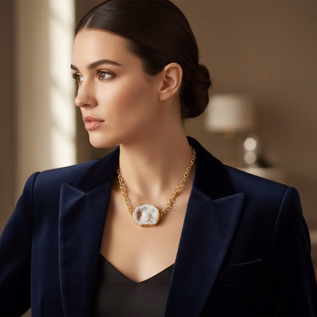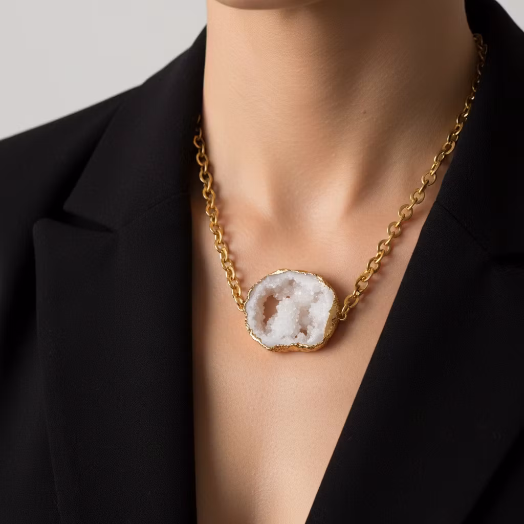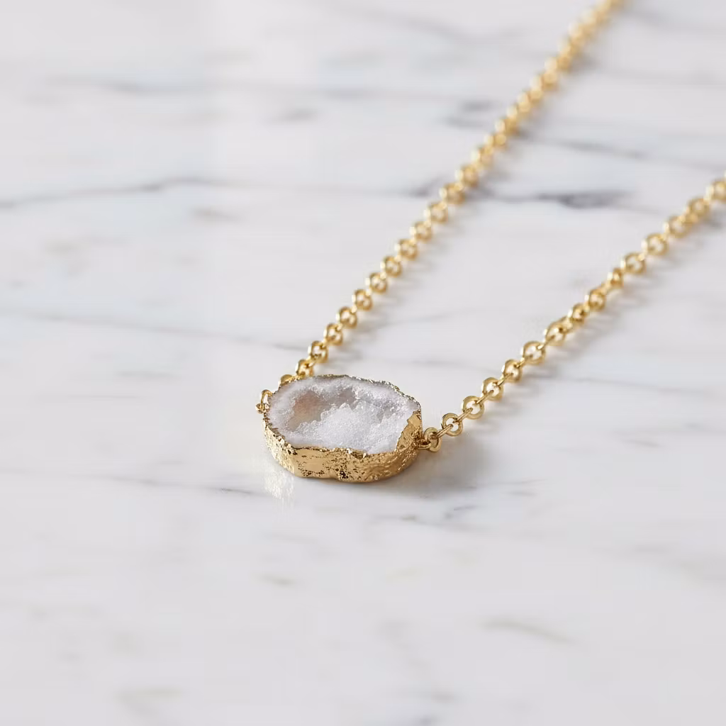 Stort guldförgyllt Statementhalsband i matt guldfinish med vit Druzy agat geod i mycket fin kvalitet med kristallisering. Glamouröst halssmycke med stor vit ihålig agat geod som drar blickarna åt sig. Halsband med vit glittrande sten.