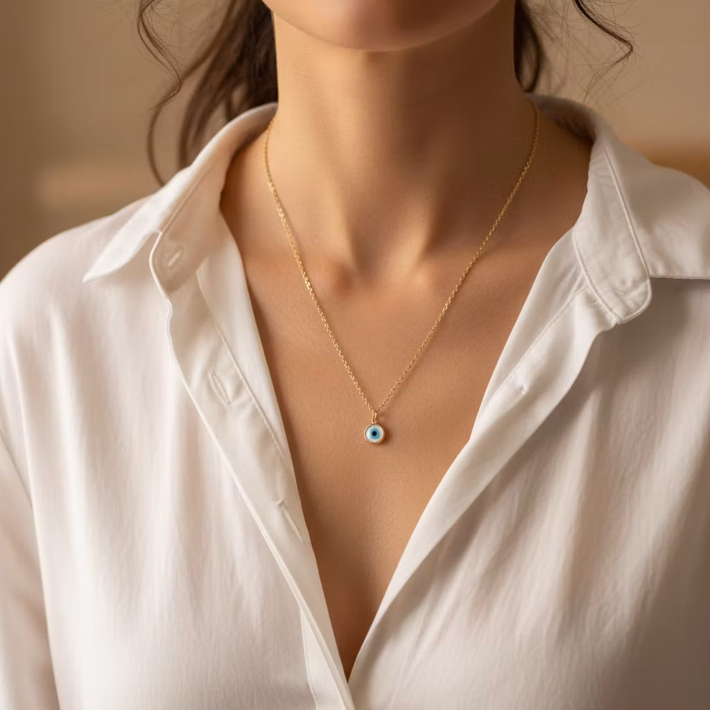 Guldpläterat halsband med smal fin kedja och litet vitt öga. Ögat är en beskyddande symbol som sägs bringa lycka, tur och beskydd åt bäraren. Det vita lilla ögat är 8mm i diameter. Snyggt kedjehalsband med litet hänge.