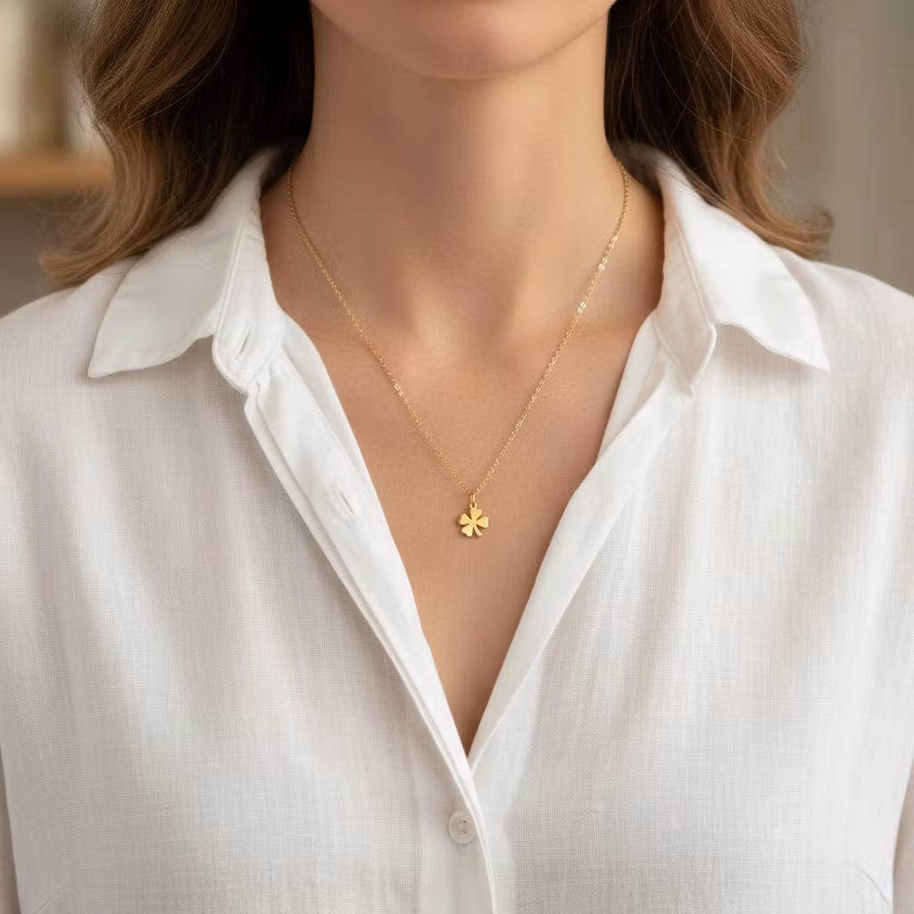 Guldpläterat lyckohalsband med smal fin ankarkedja och litet fyrklöver hänge för lycka och tur. Fyrklöverns fyra blad representerar tur, tro, hopp och kärlek. Halsbandet är perfekt som gåva. Fyrklöverhalsband i guld.
