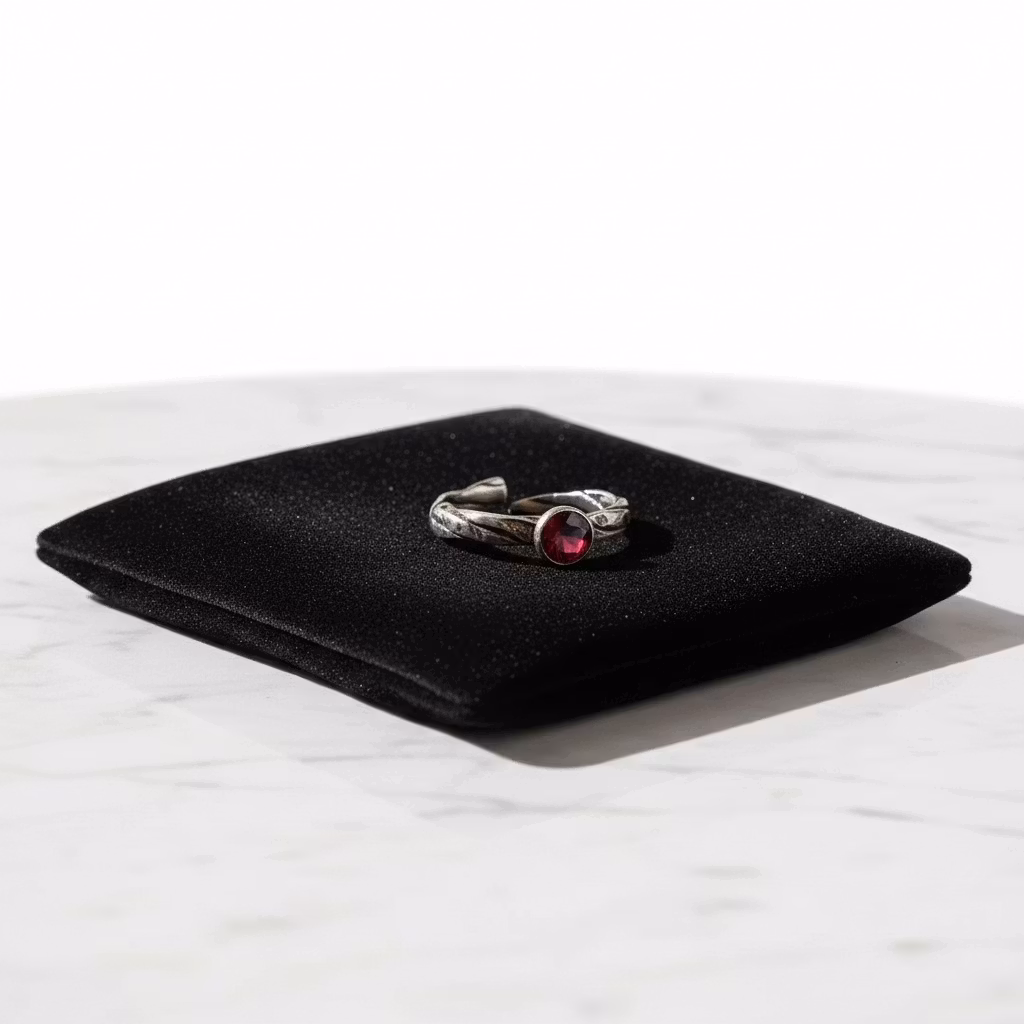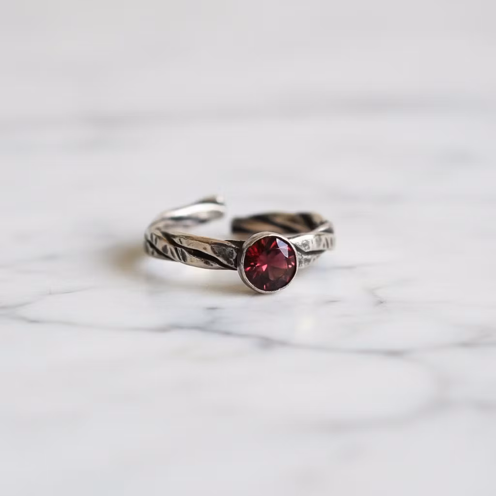 Flätad bronsring med 6mm rund facettslipad röd granat sten. Ringen är 3,5mm bred och lätt justerbar i storleken. Handgjord unik granat ring i rustik brons. Ringen har oxiderats för en antikguld finish. Då ringen är öppen baktill är det även möjligt att ha ringen på flera fingrar än bara ett. Bronsring med röd granat ädelsten. Polerduk medföljer.