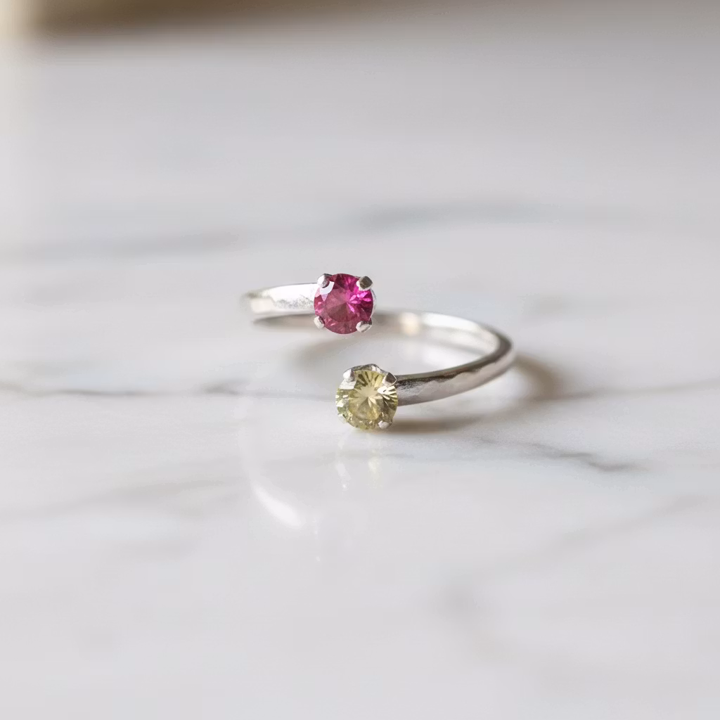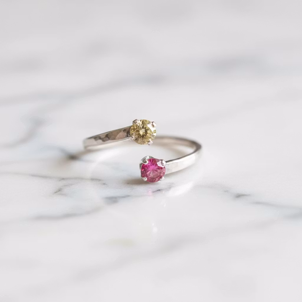 Öppen silverring med två glänsande fina CZ-stenar, en gul och en rosa sten. Ringen har en skinande blank yta med 4mm små kubisk zirconia stenar. Ringen är justerbar i storleken och går att göra både större och mindre genom att försiktigt öppna eller stänga ihop ändarna på ringen. Ringen har en hamrad yta med mixade färgstenar. Polerduk medföljer.