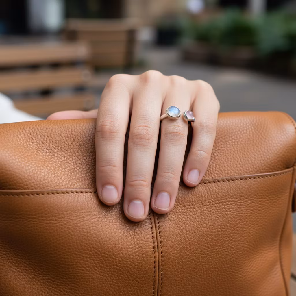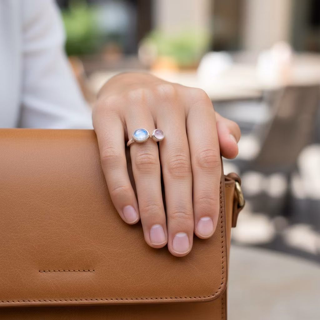 Regnbågsmånsten ring med rosa fasettslipad kalcedon sten och vit liten månsten på sidan om. En öppen justerbar silverring med tre stycken mixade ädelstenar, en 8mm oval regnbågsmånsten och 6mm rosa slipad kalcedonsten, samt en 3mm liten vit månsten. Ringen är 2,5mm bred och har en slät blank silveryta. Unik trestensring i äkta silver, perfekt för en vacker stil. Polerduk medföljer.