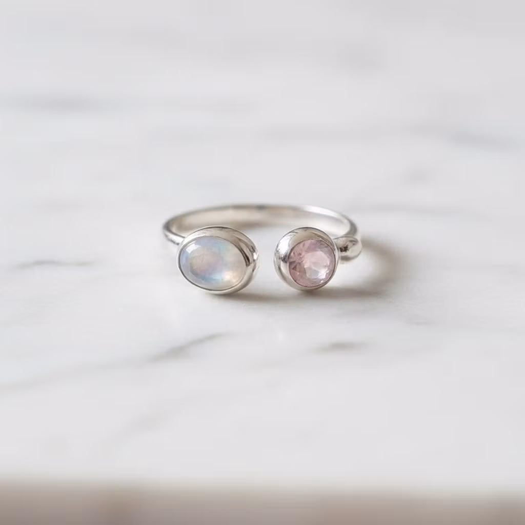 Regnbågsmånsten ring med rosa fasettslipad kalcedon sten och vit liten månsten på sidan om. En öppen justerbar silverring med tre stycken mixade ädelstenar, en 8mm oval regnbågsmånsten och 6mm rosa kalcedonsten, samt en 3mm liten vit månsten bredvid den rosa kalcedonen. Ringen är 2,5mm bred och har en slät blank silveryta. Fin trestensring i äkta silver. Polerduk medföljer.
