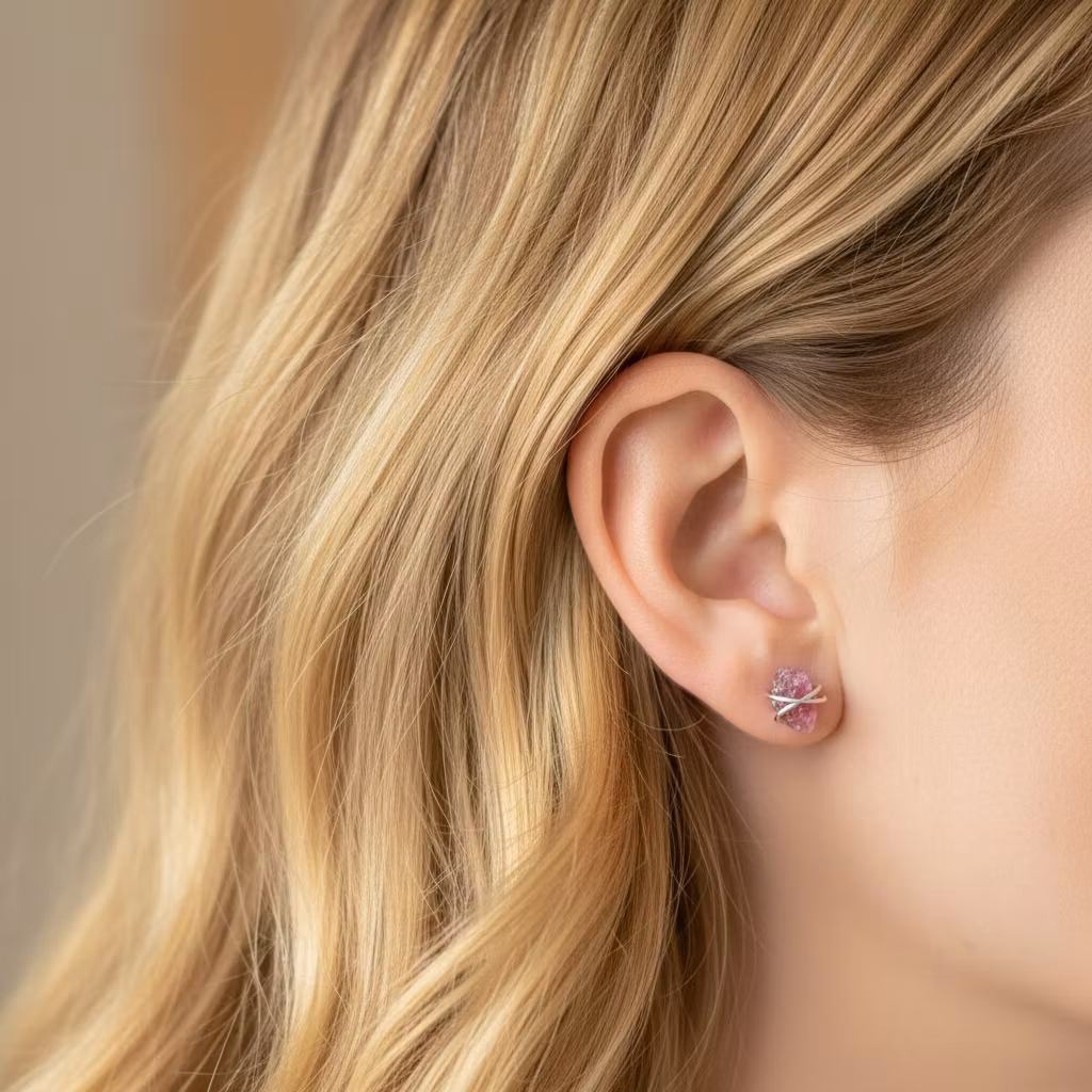 Små silverörhängen med rosa rå turmalinstenar lindade i silvertråd. Studsörhängen av äkta silver med naturliga turmaliner. Örhängen med små månadsstenar oktober. Rosa turmalin örhängen som passar för alla tillfällen.