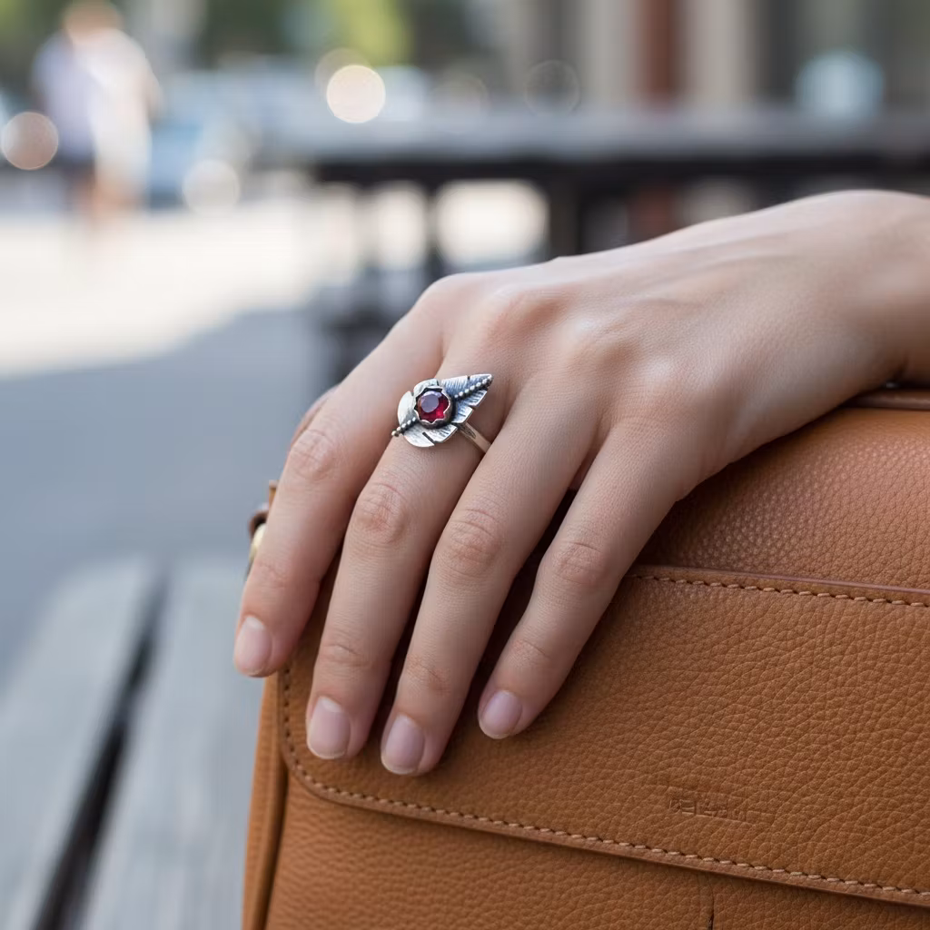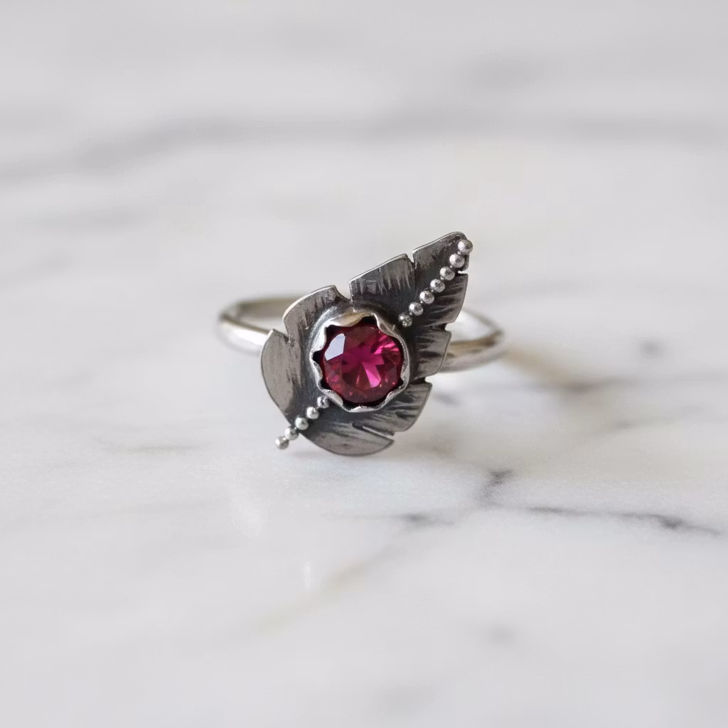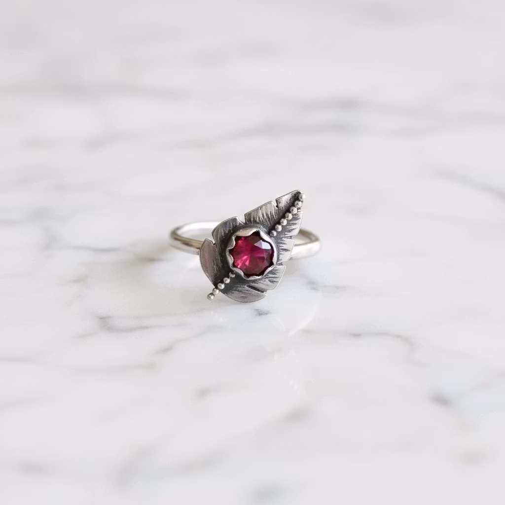 Ring i äkta silver med löv och rund rubin sten i mycket fin kvalitet. Stenen är 6mm och lövet 15mm långt. Ringen är 2mm bred och har en hamrad blank silveryta. Handgjord och unik silverring med detaljrikt löv och röd glänsande fin ädelsten. Den här fina lövringen passar för en vacker och unik stil. Polerduk medföljer.