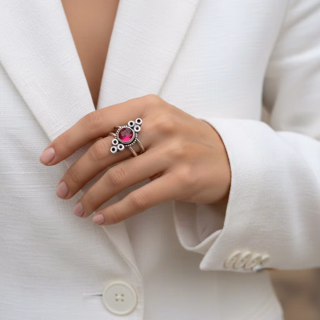 Äkta silverring med rosa rund fasettslipad kvartskristall och dubbla ringband. Silverringen har en 7mm turmalinrosa kristall. Ringen är 20mm hög med fina unika detaljer runt stenen. Ringen är skapad av återvunnet sterling silver. Polerduk medföljer.