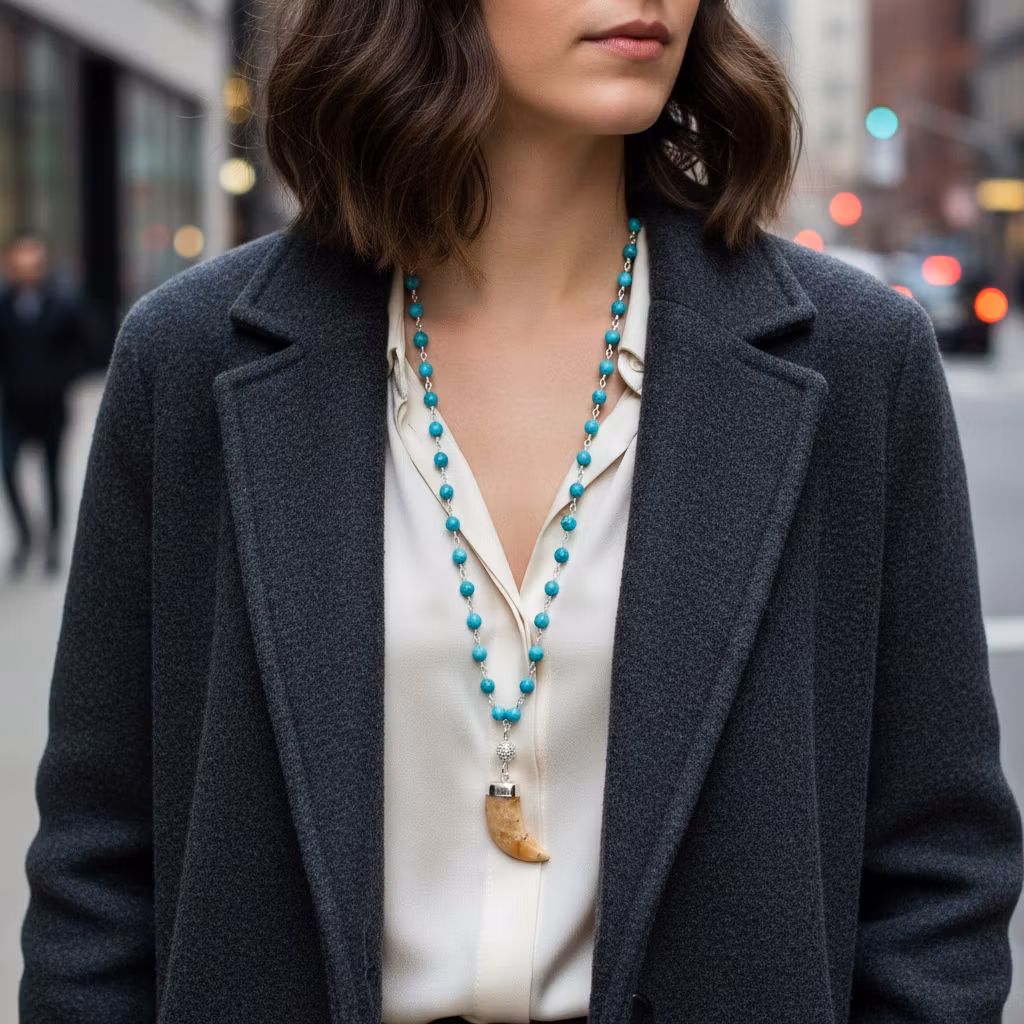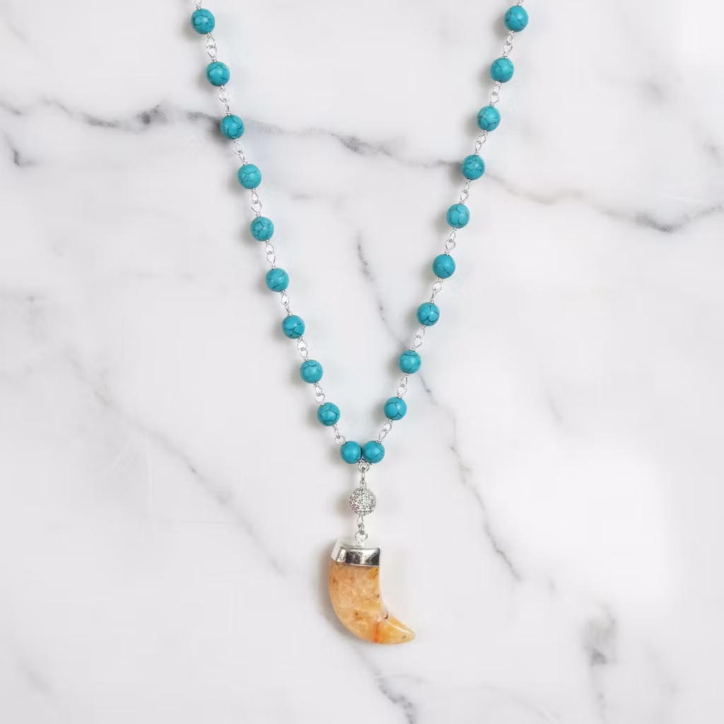 Långt turkosa pärlhalsband med 10mm strasskula och orange stort ädelstenshänge i form av en beta. Pärlhalsbandet har 8mm släta turkospärlor länkade i silverpläterad metalltråd. Hänget är ca 5,5cm långt av ädelsten agat. Fint pärlhalsband av turkospärlor.