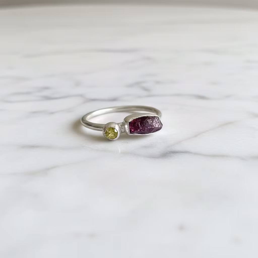 Tvåstensring i äkta silver med rå granat och liten rå peridot sten bredvid. Ringen är tillverkad av 925 sterling silver med en skinande blank silveryta. Ringen har en avlång röd granat och en liten rund grön peridotsten. Stenarna är äkta naturliga. Granaten är 9mm lång och peridoten 3mm. Rå ädelstensring med januari och augustis månadsstenar. Polerduk medföljer.