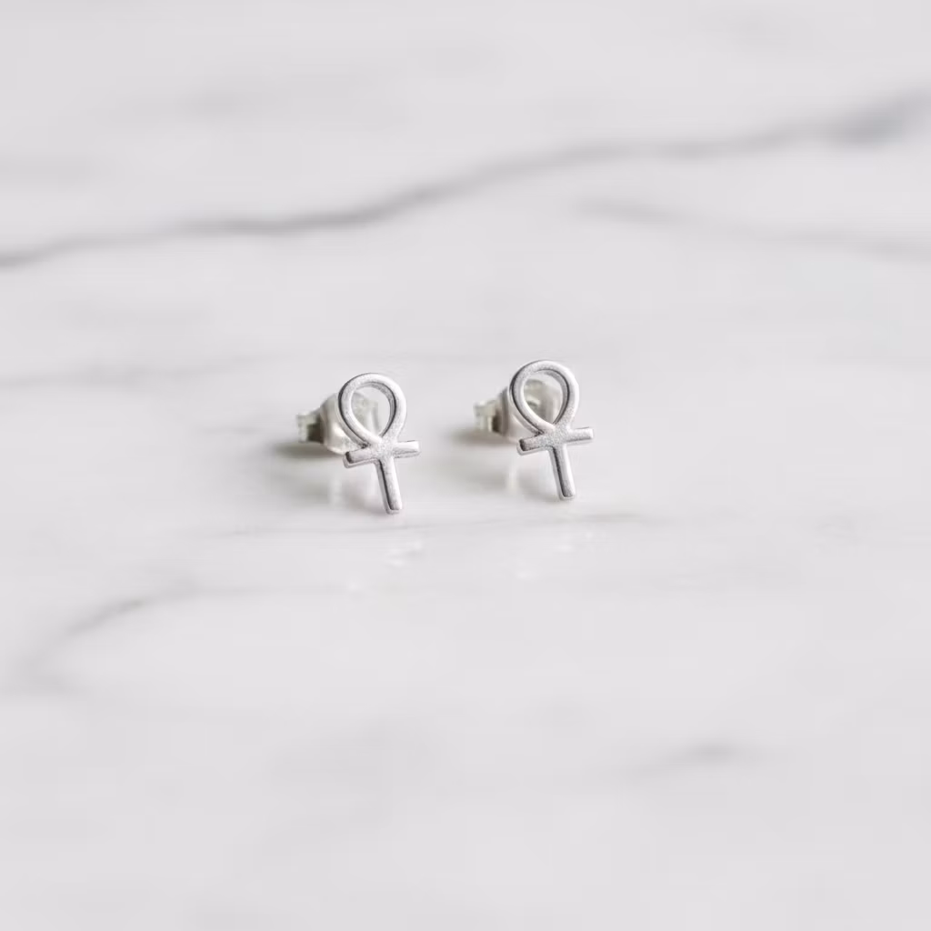 Små Ankhkors örhängen i äkta silver med stift för hål i öronen. Stiftörhängen med tidlösa Ankhkors symboler, en Egyptisk forntid symbol som står för livet, återfödelse och odödlighet. Tidlösa örhängen av sterling silver. Välj mellan släta och hamrade örhängen. Polerduk medföljer.