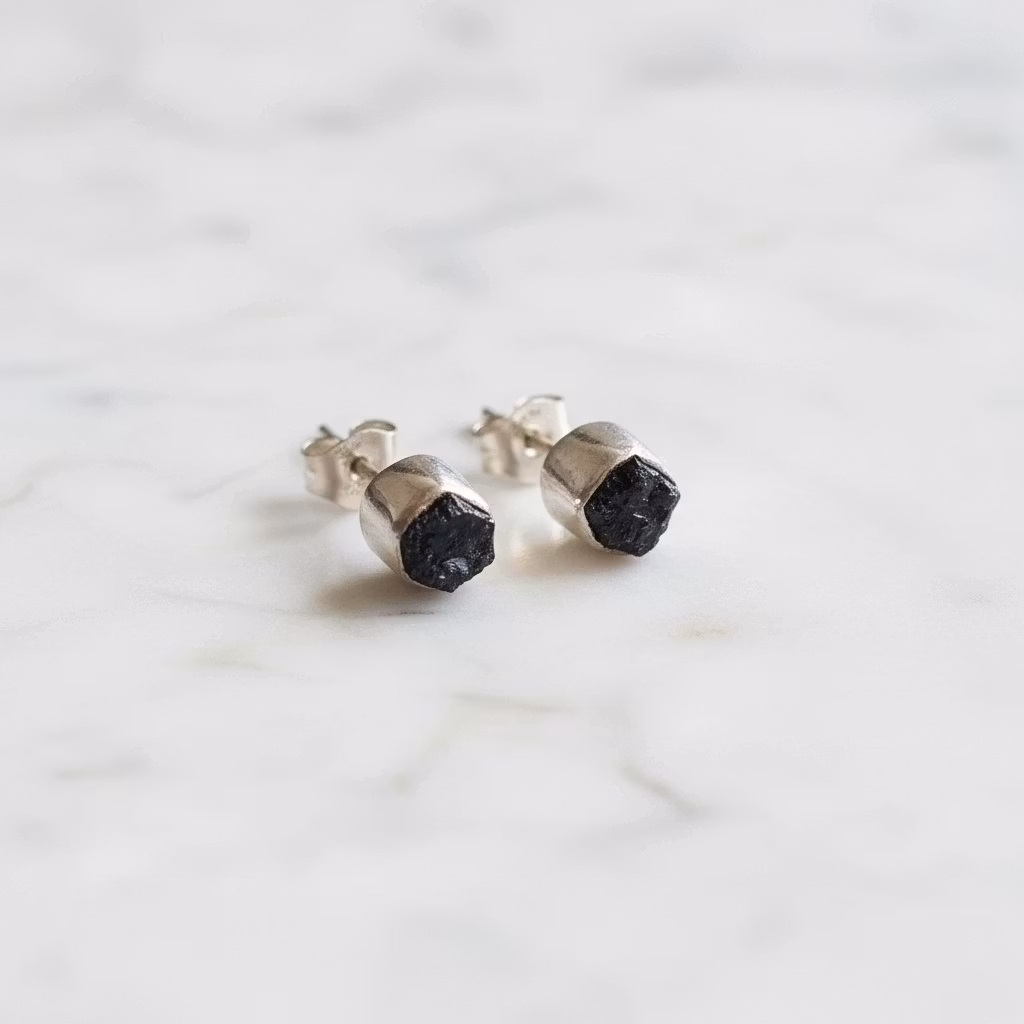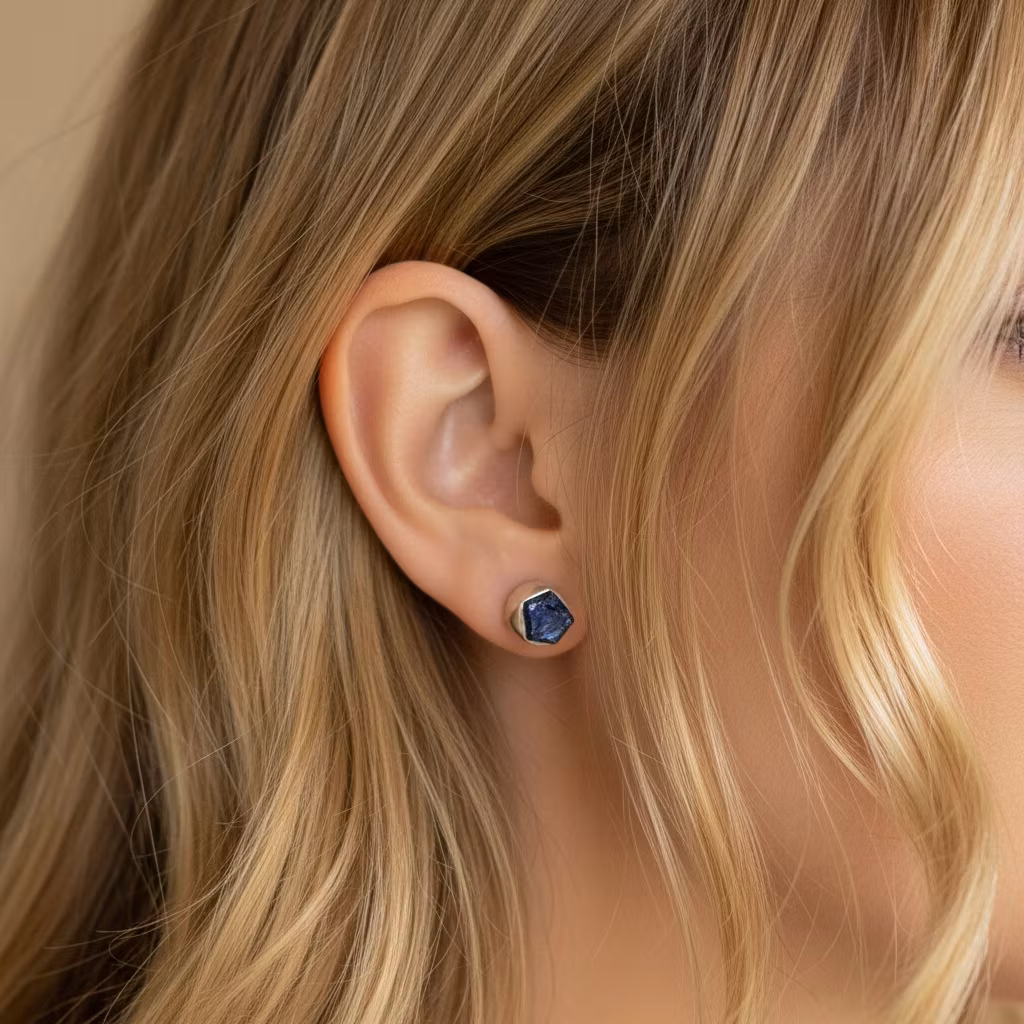 Blå rå safir örhängen i äkta silver med stift för hål i öronen. Silverörhängen med äkta naturliga safirstenar som är råa och har en platt och grov yta. Små solida örhängen med månadsstenar september. Eleganta studsörhängen med blå safir. Polerduk medföljer.