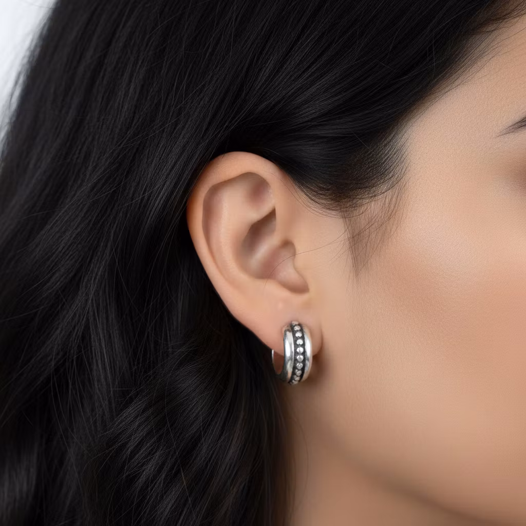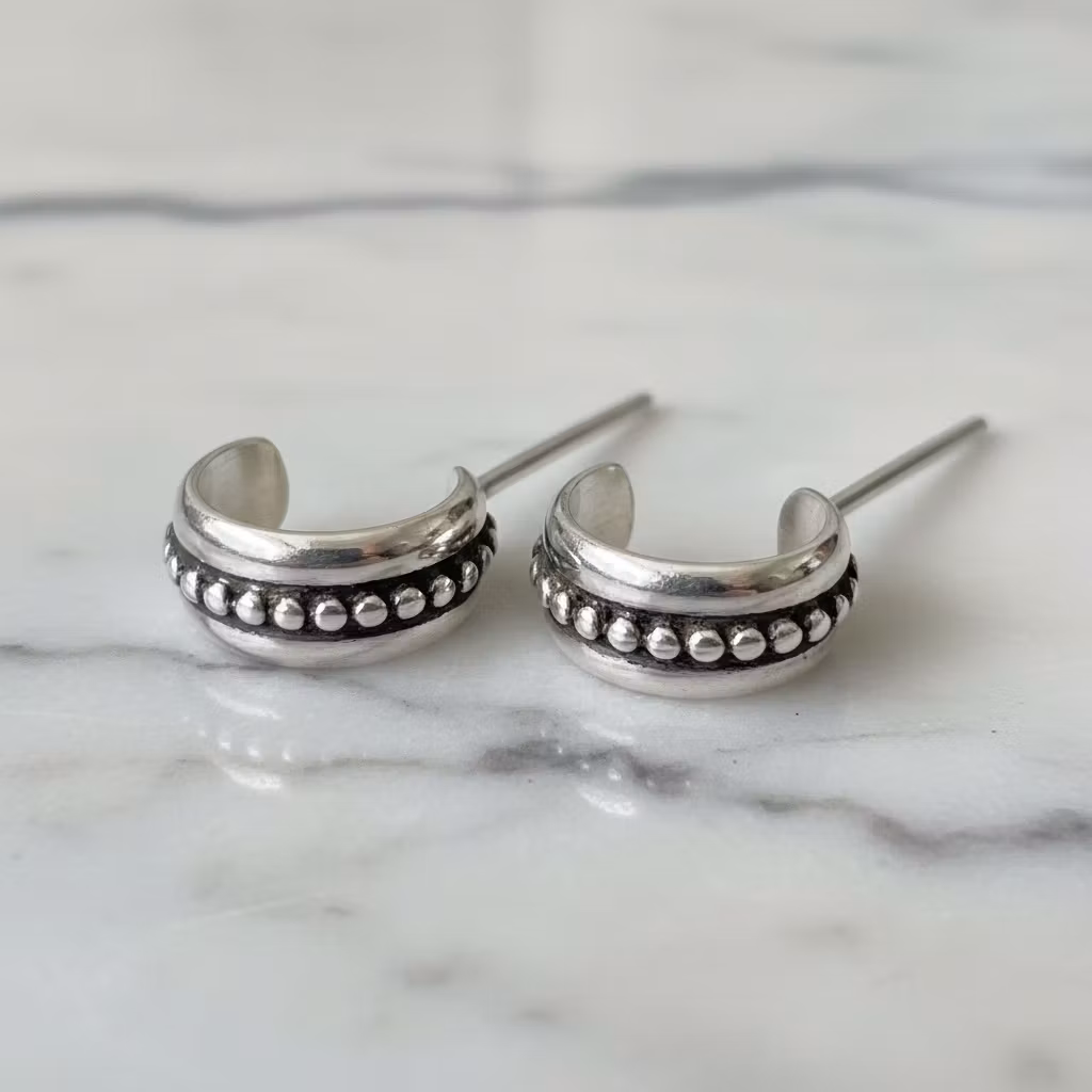 Korta silverörhängen hoops i äkta silver med oxiderade detaljer. Örhängena är 4,2mm breda och halvrunda i formen. Små runda örhängen tillverkade av sterling silver med fina detaljer. Trendiga örhängen hoops för alla tillfällen. Polerduk medföljer.