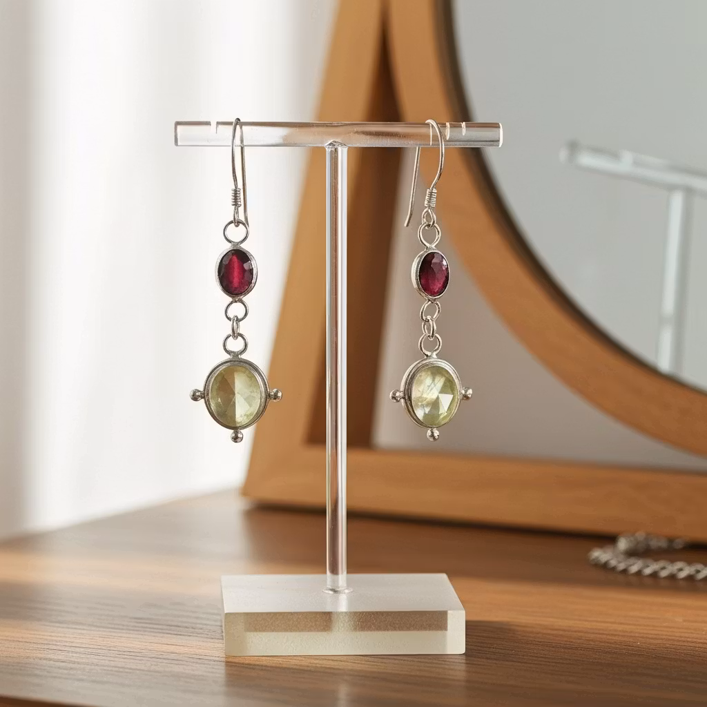 Hängande örhängen i silver med fasettslipade ovala regnbågsmånstenar och slipade röda granater. Festliga örhängen i äkta silver med skimrande vackra regnbågsmånstenar och djupröda granat ädelstenar i vacker kombination. Vackra örhängen med mixade ädelstenar. Polerduk medföljer.