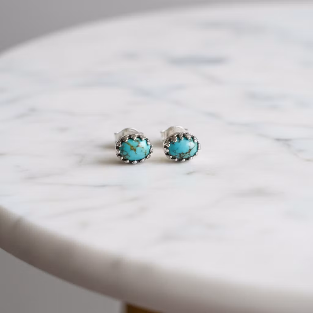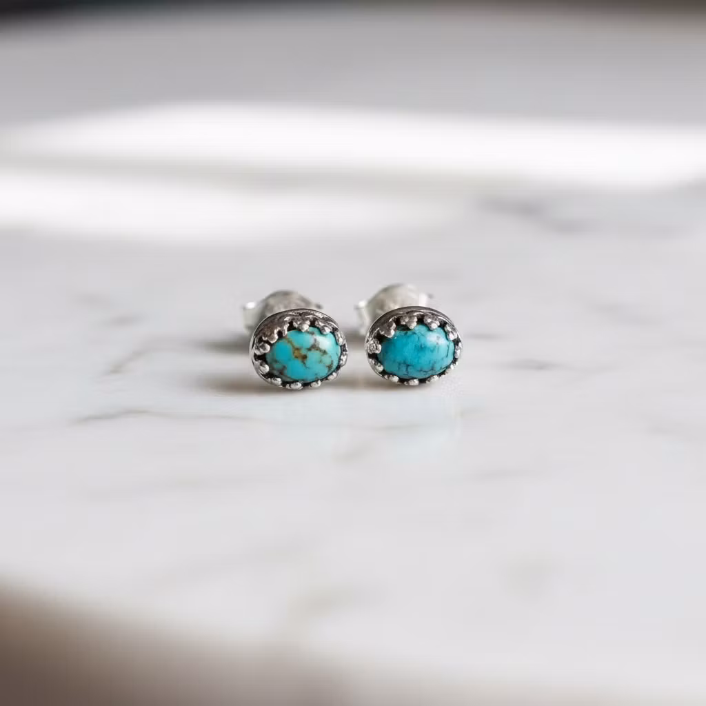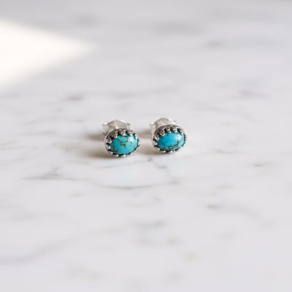 Små ovala turkos örhängen i äkta silver med vacker dekorativ kant runt stenen. Äkta turkos örhängen med små naturliga Carico lake turkoser i fin kvalitet. Månadsstensörhängen december. Eleganta örhängen som passar fint till alla tillfällen. Polerduk medföljer.