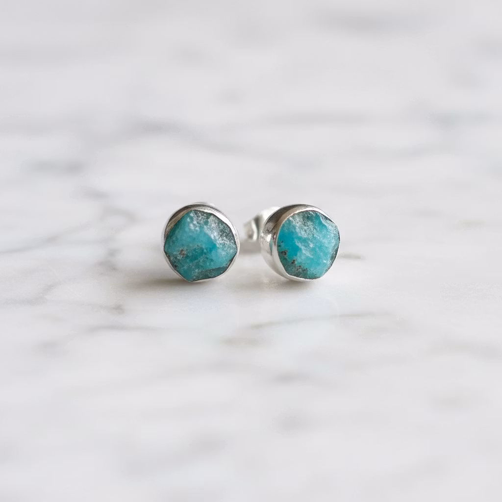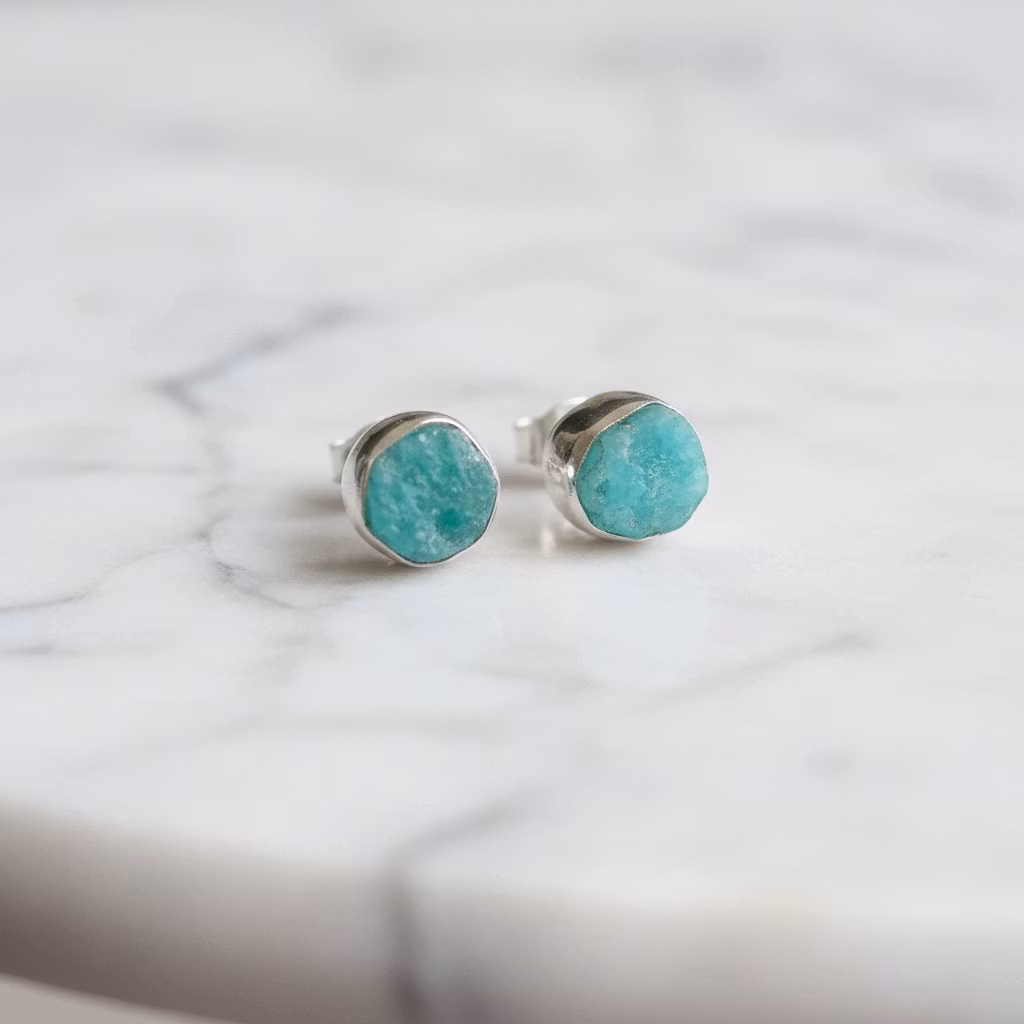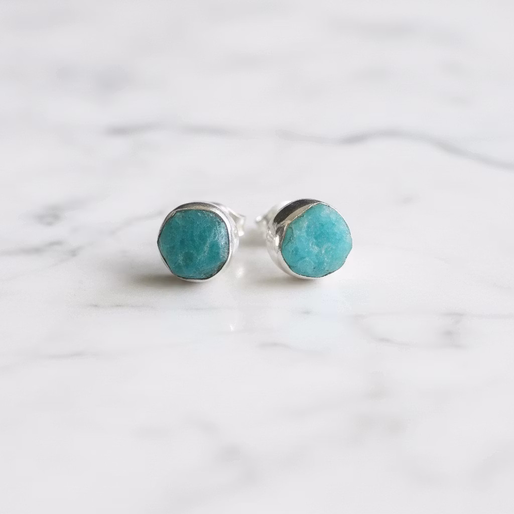 Rå amazonit örhängen i äkta silver med naturliga stenar i mycket fin kvalitet. Stiftörhängen med vackra turkosgröna oslipade ädelstenar med platt grov yta. Alla amazoniter är unika och skiljer sig lite åt i mått, form och nyans. Alla stenar är precis lika vackra. Grova amazonit örhängen i silver. Polerduk medföljer.