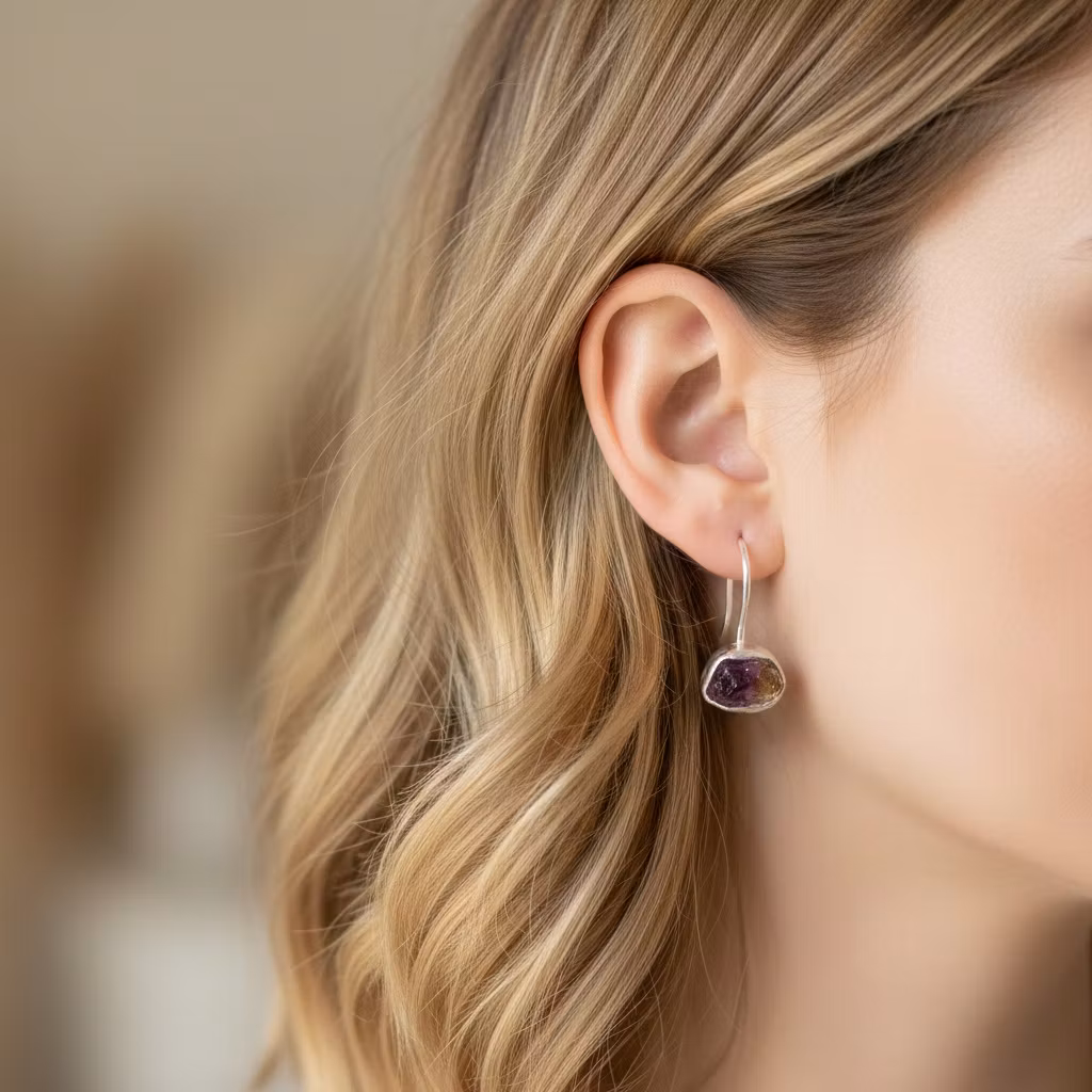 Rå ametrin örhängen i äkta silver med långa öronkrokar och rå naturlig ametrin kristall. Örhängena är tillverkade i sterling silver med fantastiskt vackra glänsande ametriner i fin kvalitet. Kristallerna är mellan 8mm-10mm stora. Ametrin är en blandning av ametist och citrin. Alla kristaller är unika i form, mått och färgnyans. Örhängena är perfekt för en oslipad naturlig look. Polerduk medföljer.