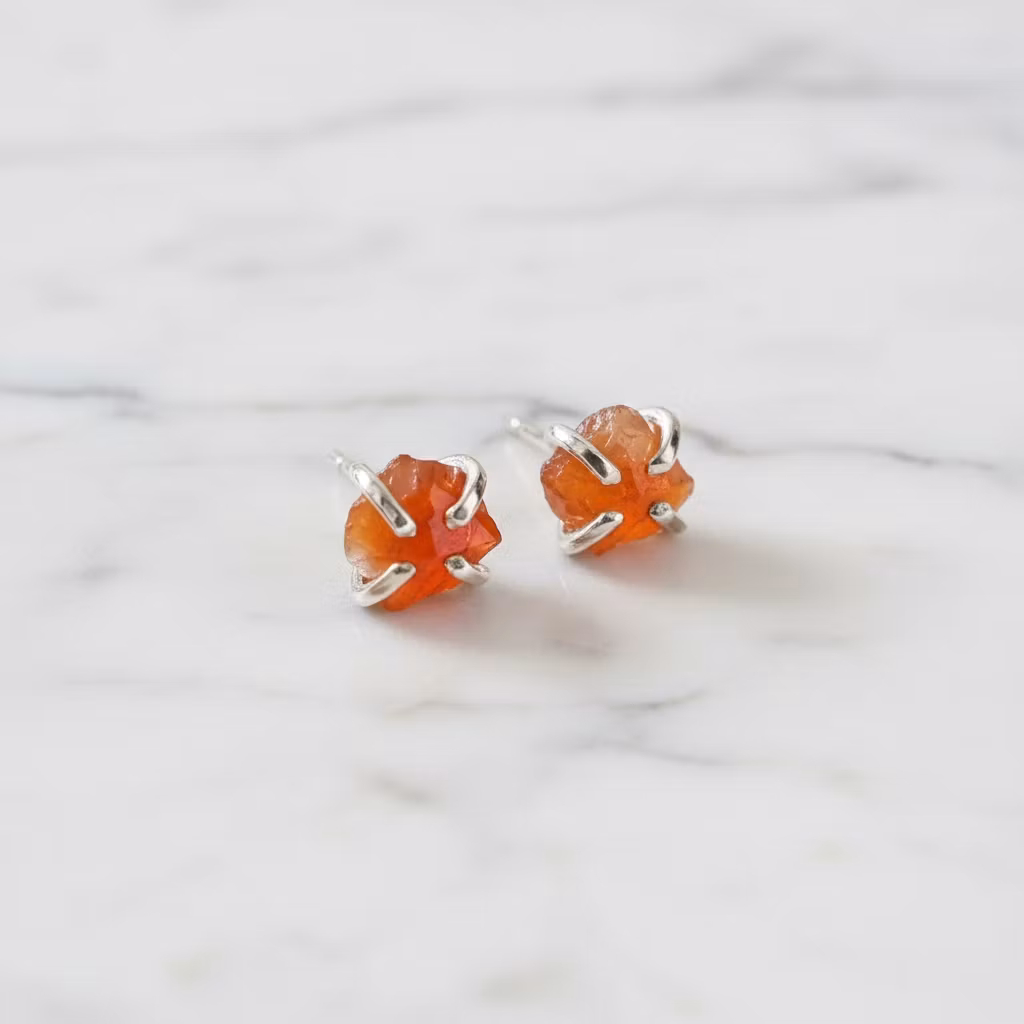 Rå karneol örhängen i äkta silver med orange små karneol stenar i klofattning. Stiftörhängen med glänsande vackra karneoler i fantastisk fin kvalitet. Örhängen med orange oslipade ädelstenar i orangea nyanser. Vackra ädelstensörhängen med rå attityd.