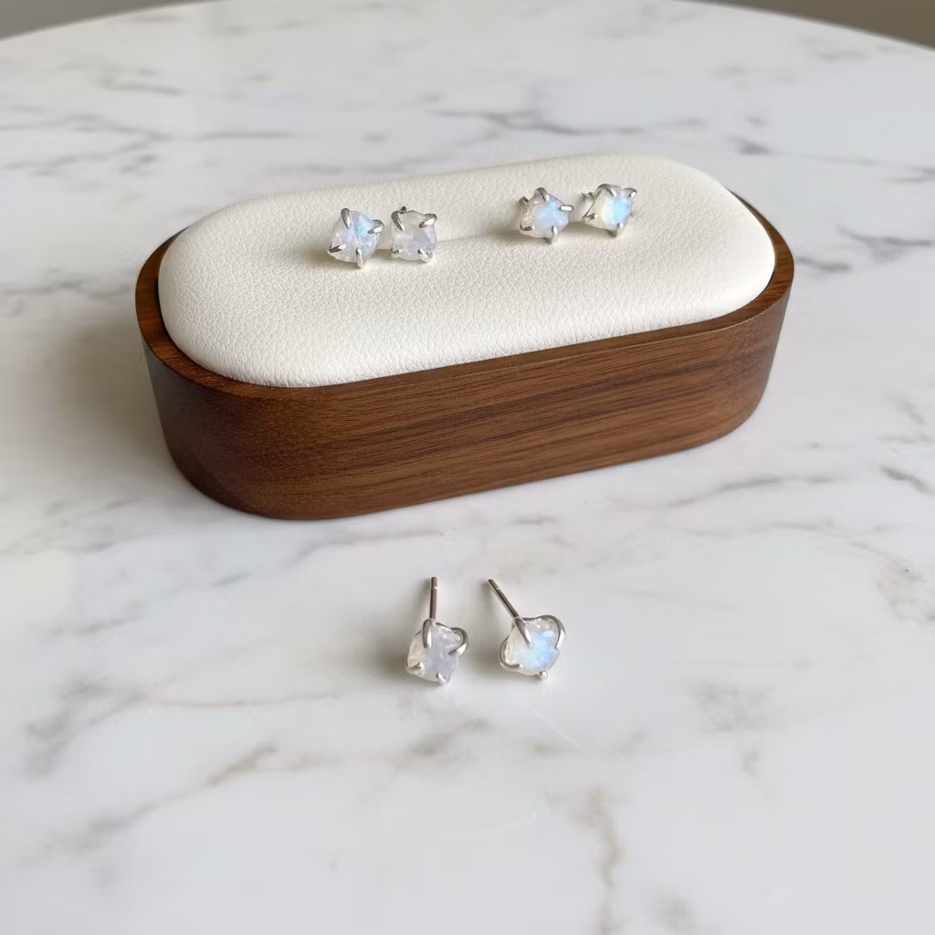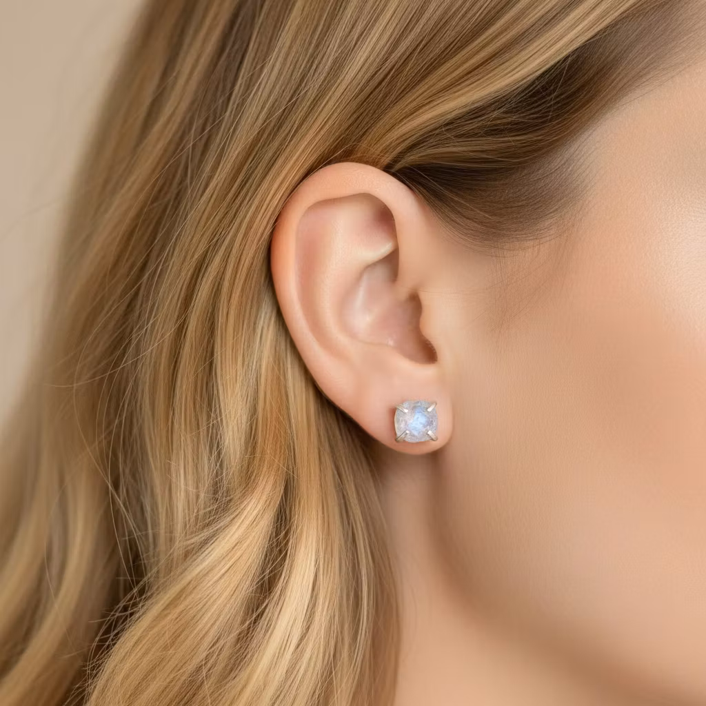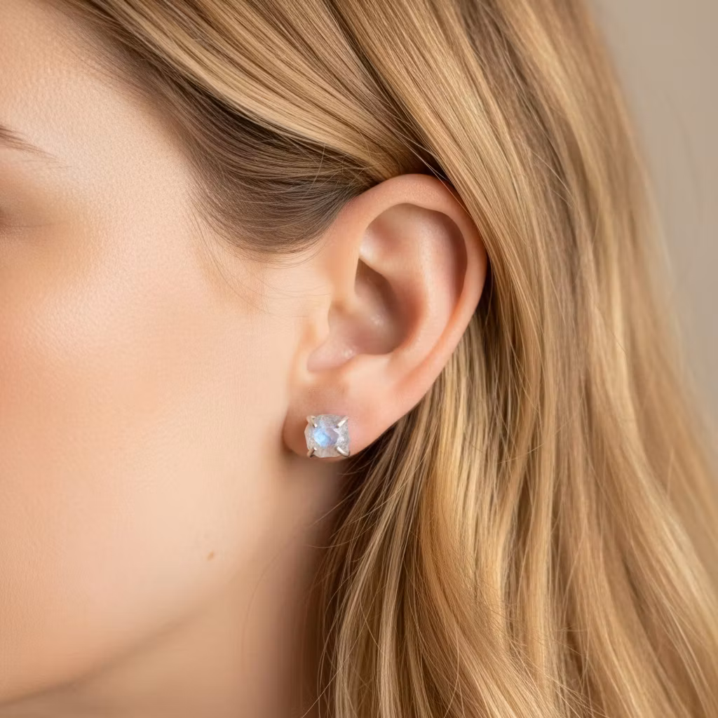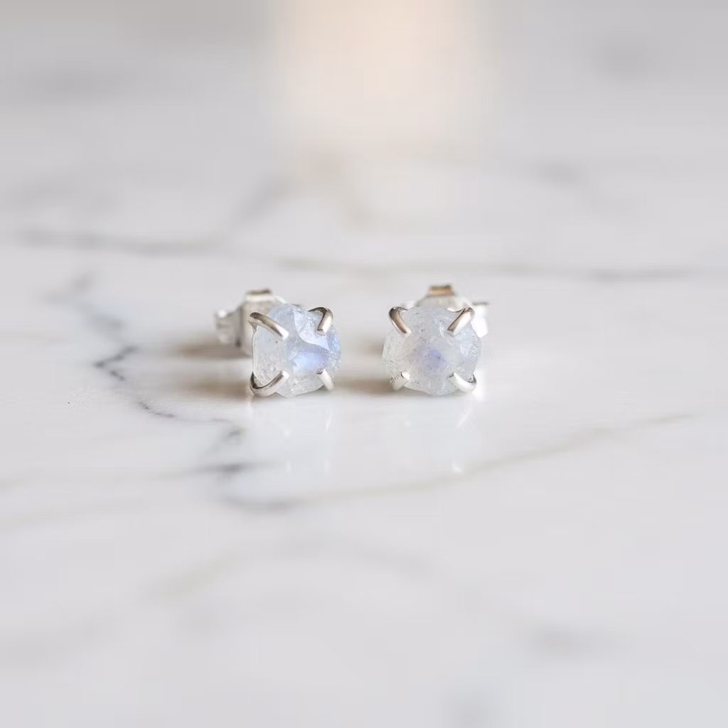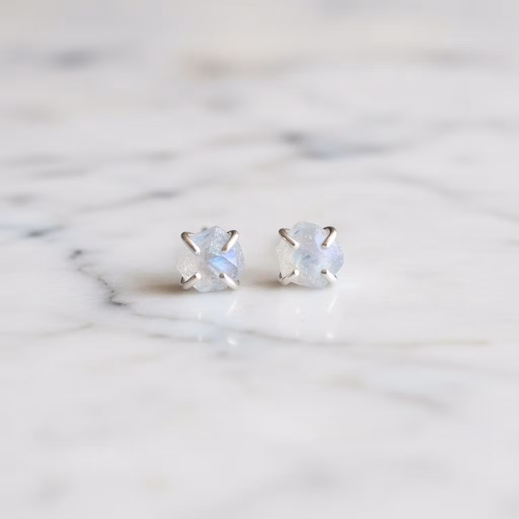Rå månsten örhängen i äkta silver med glänsande vackra oslipade naturliga regnbågsmånstenar i klofattning. Månstenarna är i mycket fin kvalitet. Studsörhängen med vita råa kristaller som är överhängande vita med skimmer. Regnbågsmånsten är en vit kristall som skimrar i regnbågens färger när stenen träffas av ljuset. Månadsstensörhängen juni.