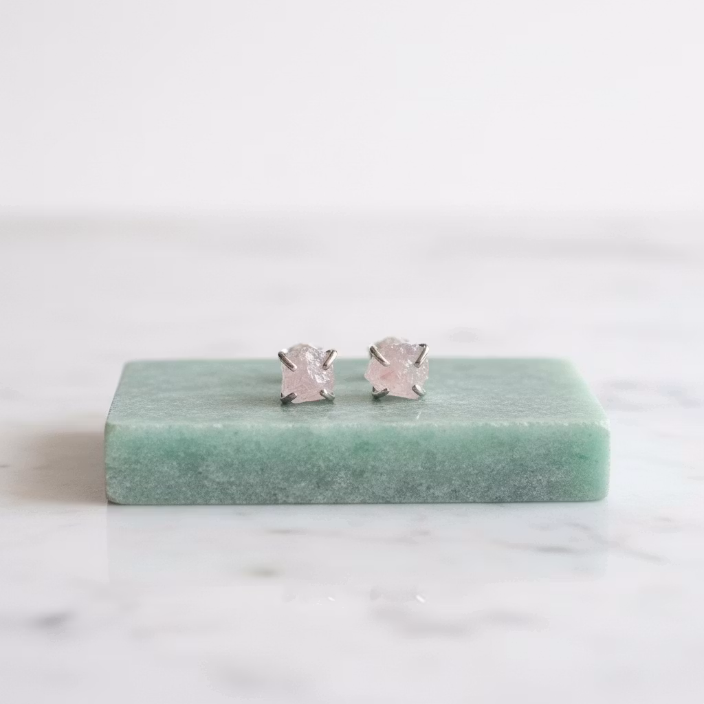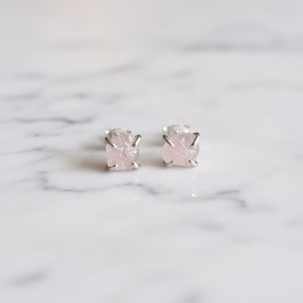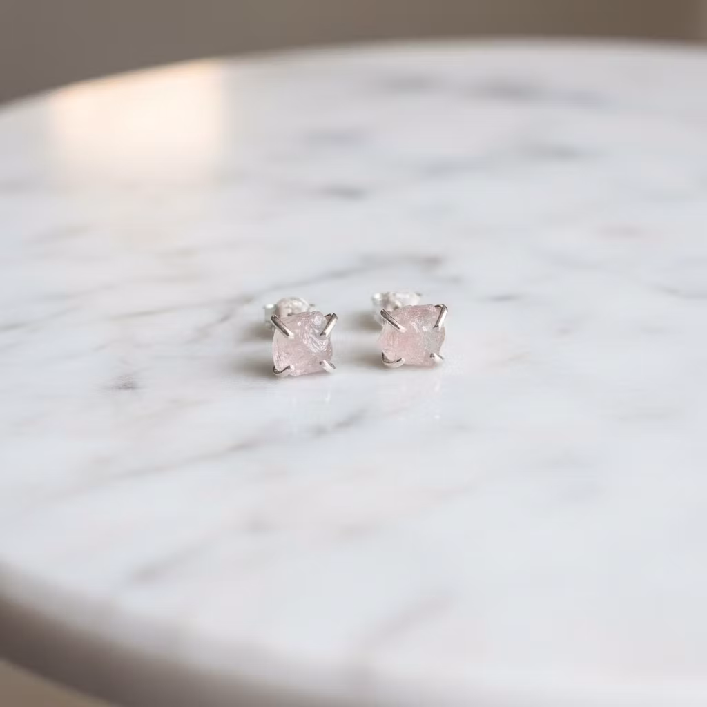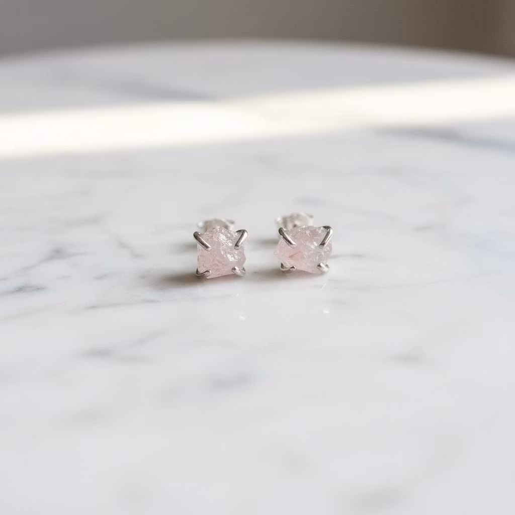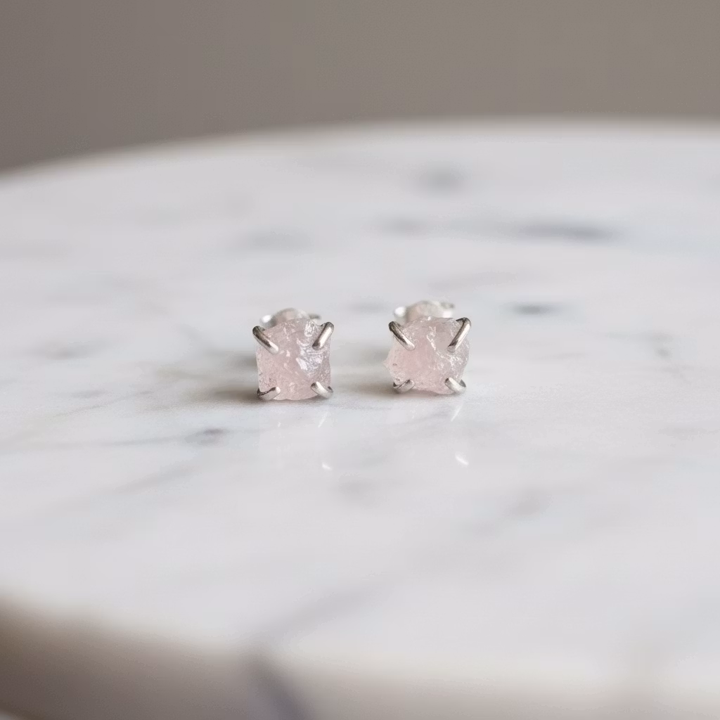 Rå rosenkvarts örhängen i äkta silver med naturliga rosenkvartskristaller i klofattning. Stiftörhängen med glänsande fina rosenkvarts i mycket fin skimrande kvalitet. Månadsstensörhängen oktober. Rosenkvarts är stenen som står för kärleken, perfekt gåva till den du håller kär.