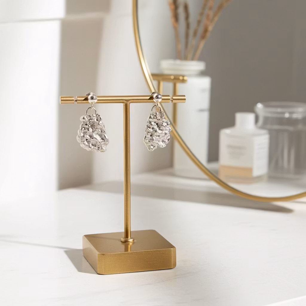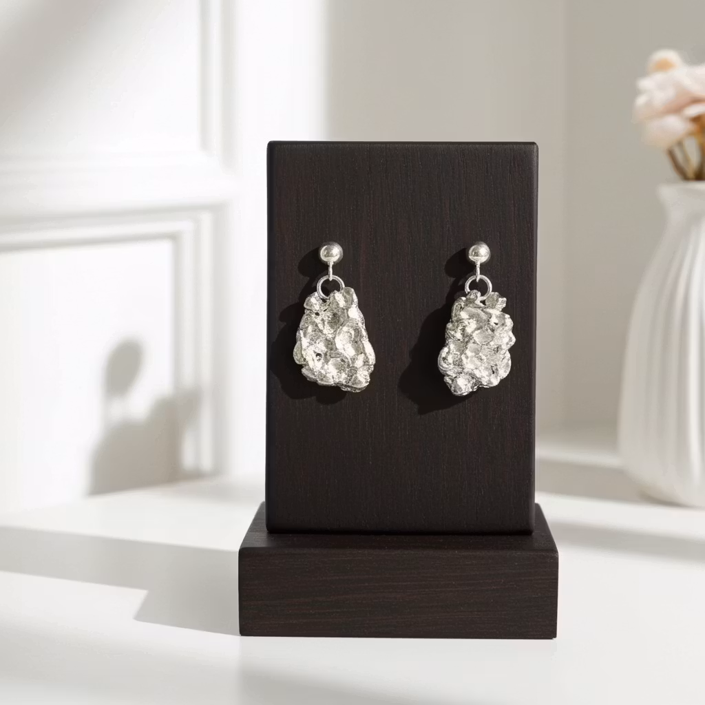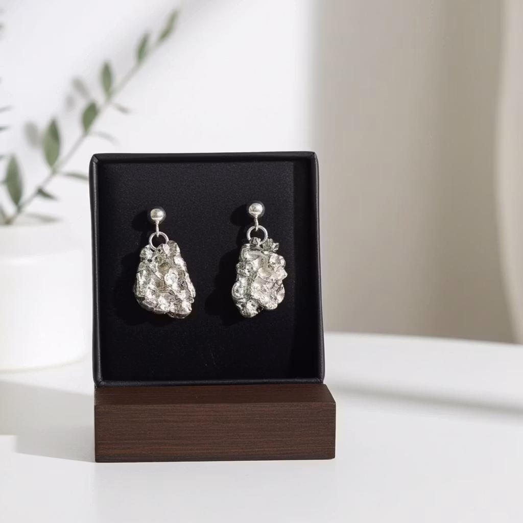 Rustika hängande silverörhängen med stift för hål i örat. Örhängena har en 3mm slät kula med hängande organiska silverplattor skapade från smält återvunnet sterling silver. Örhängena är handgjorda, därför skiljer sig varje örhänge lite åt i form, tjocklek, struktur och mått. Eleganta örhängen som dinglar, perfekt för en unik stil. Polerduk medföljer.