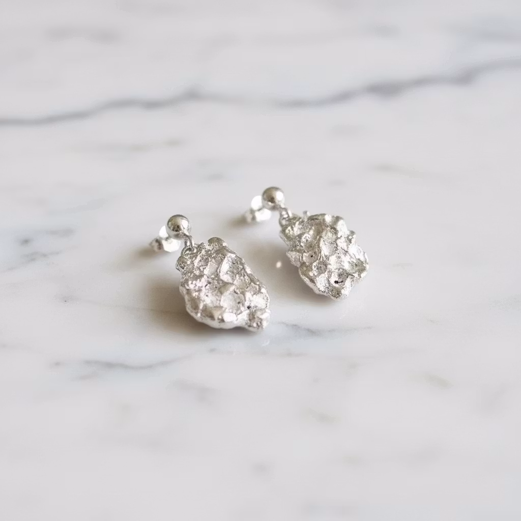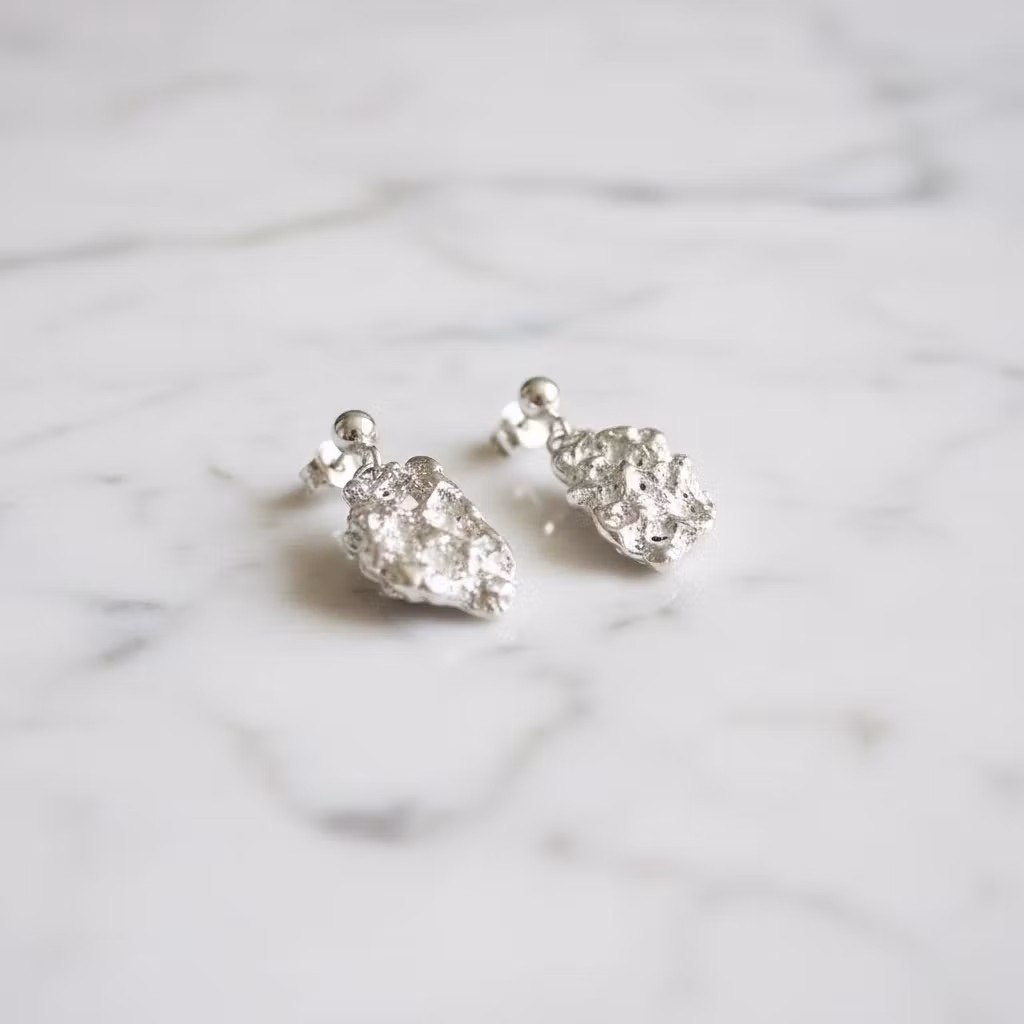 Hängande rustika silverörhängen nuggets med stift för hål i örat. Örhängena har en 3mm slät kula med hängande organiska silverplattor skapade från smält återvunnet sterling silver. Örhängena är handgjorda, därför skiljer sig varje örhänge lite åt i form, tjocklek, struktur och mått. Eleganta örhängen som dinglar, perfekt för en unik stil. Polerduk medföljer.