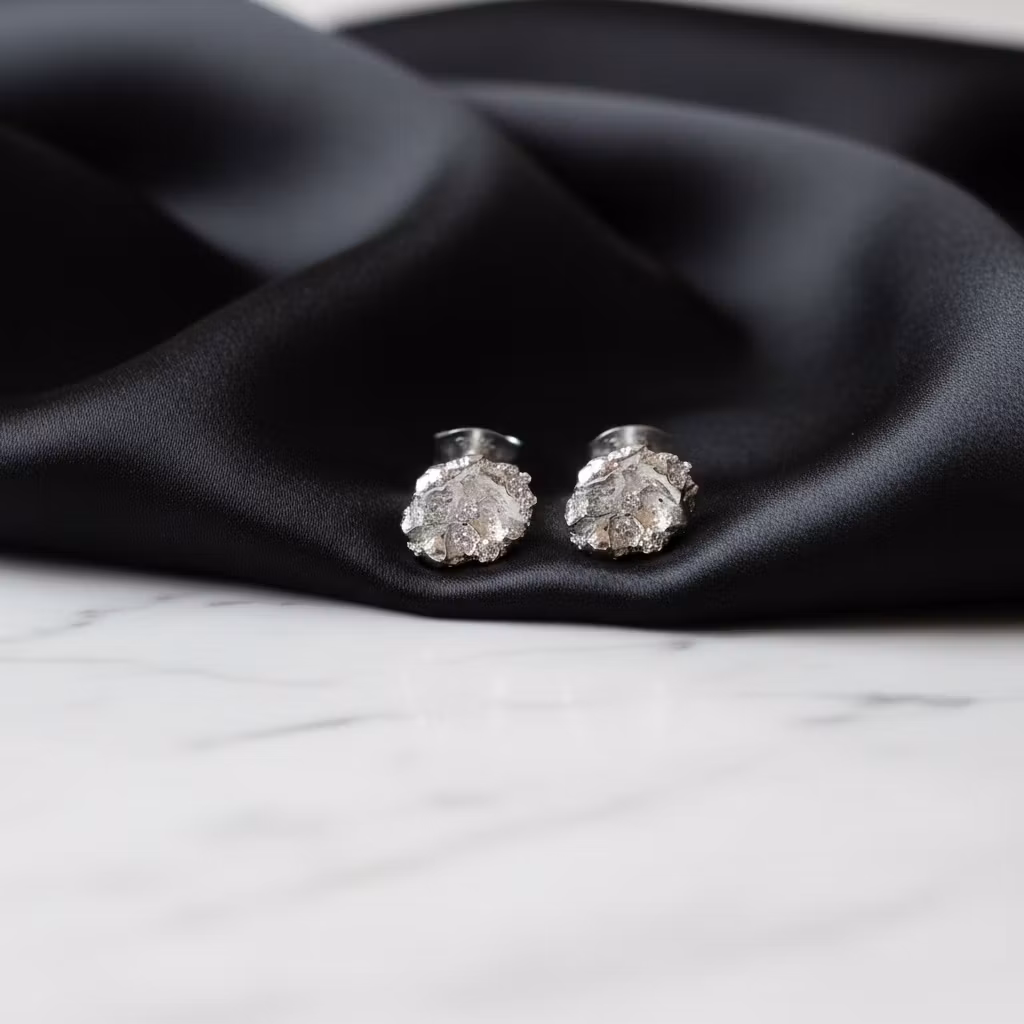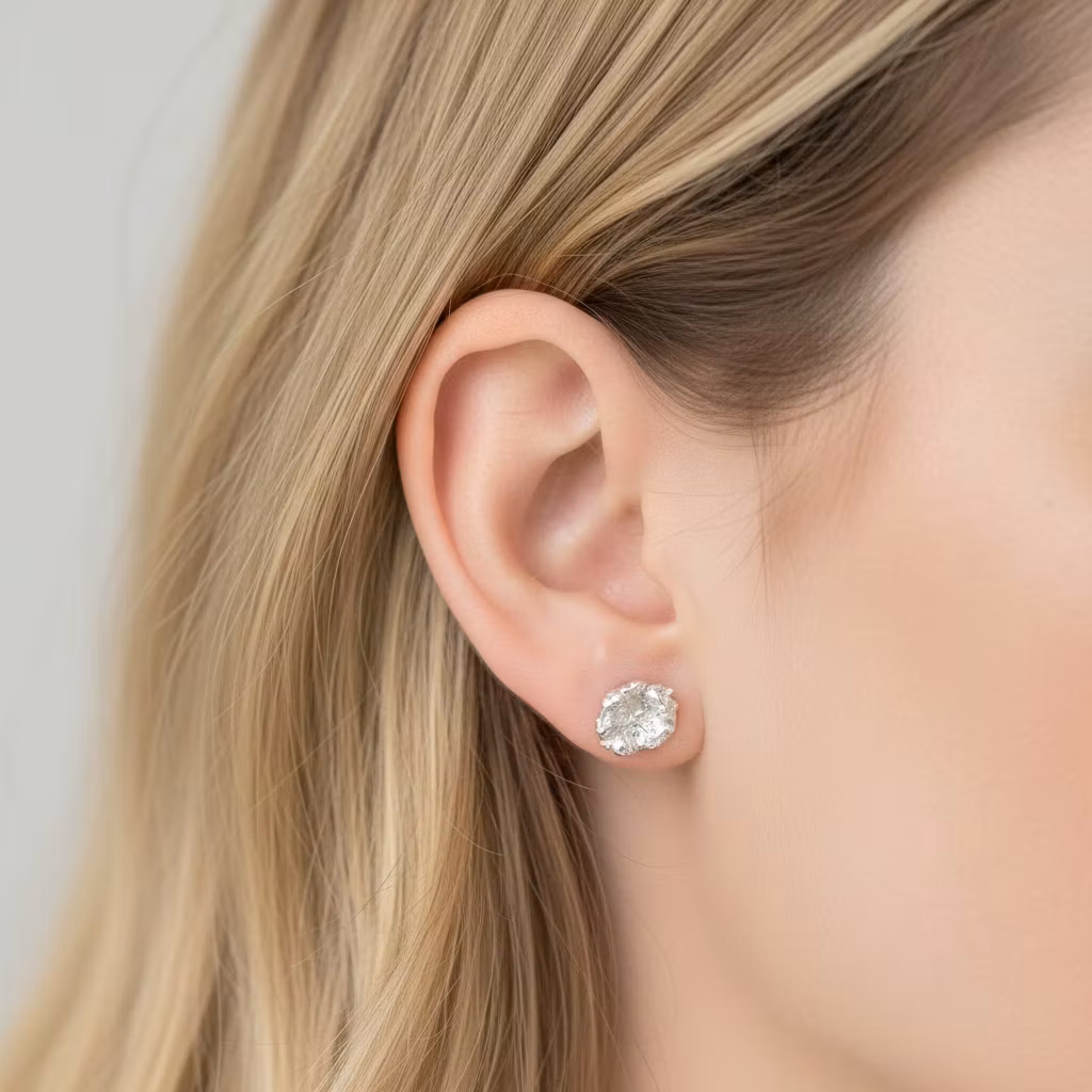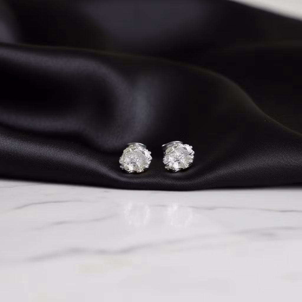 Små rustika stiftörhängen i äkta silver med organiska nuggets skapade från smält återvunnet sterling silver. Alla örhängen är unika eftersom örhängena är handgjorda. Form, mått och tjocklek på örhängena skiljer sig något åt. Örhängen med små silvernuggets, perfekt för en elegant stil. Polerduk medföljer.