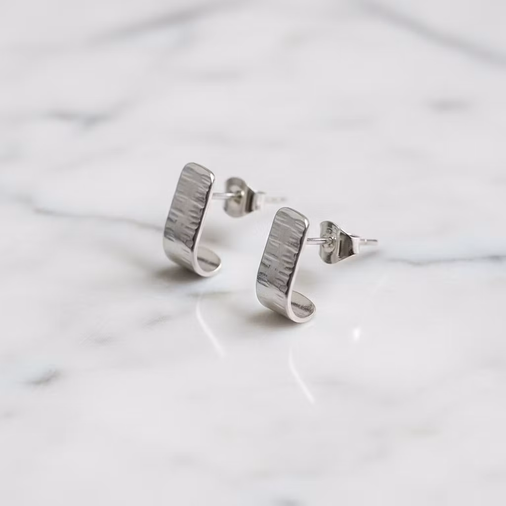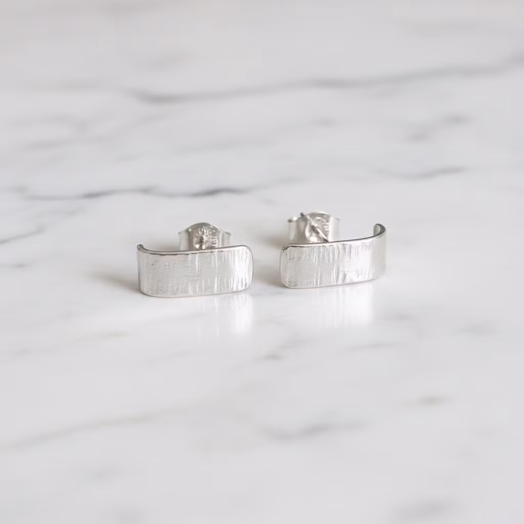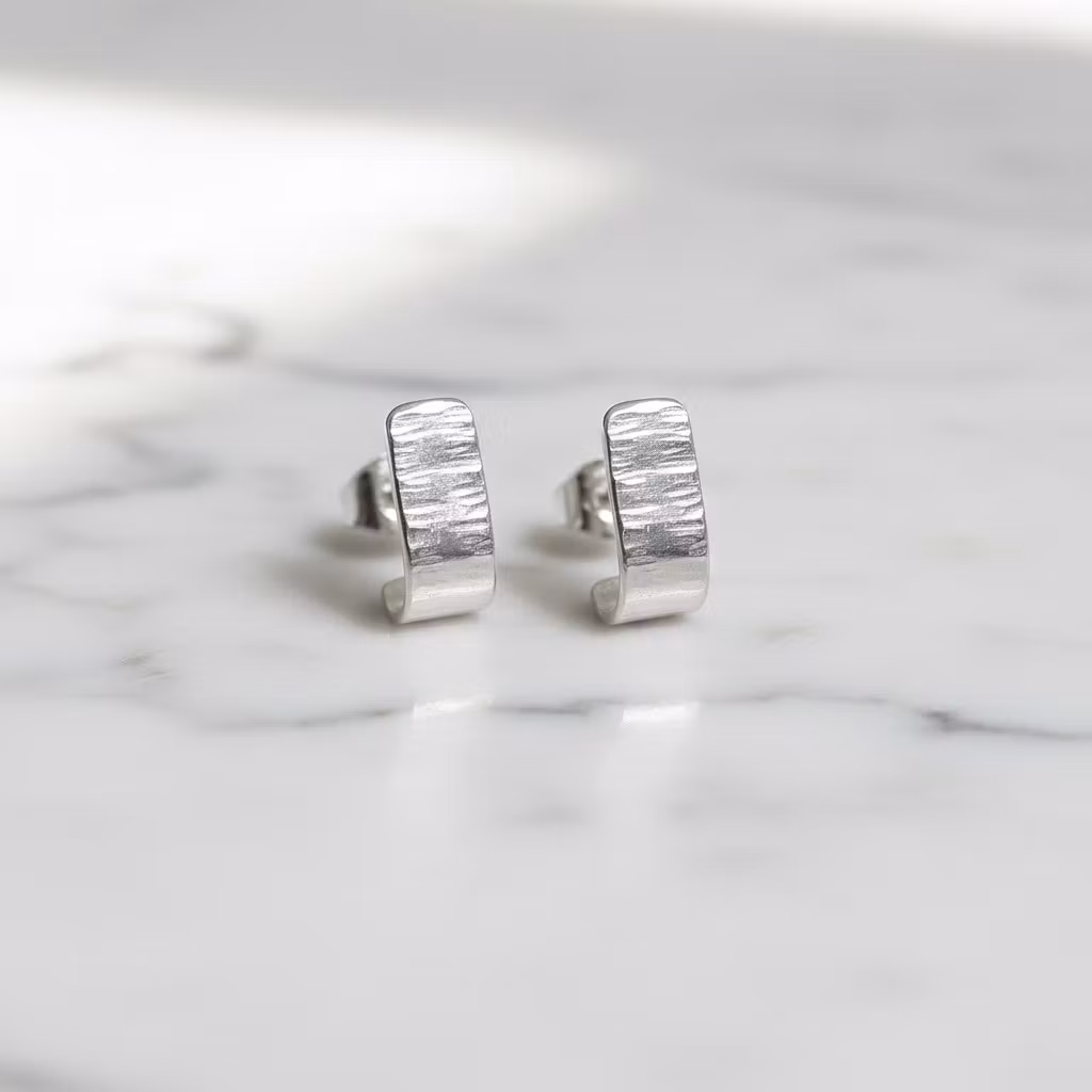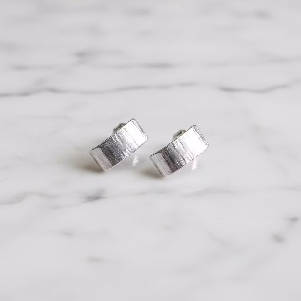 Moderna silverörhängen huggies med hamrad blank silveryta. Korta och breda örhängen i äkta silver med stift för hål i örat. Eleganta örhängen av återvunnet sterling silver som kramar om dina öronsnibbar. Örhängen i modern stil. Polerduk medföljer.