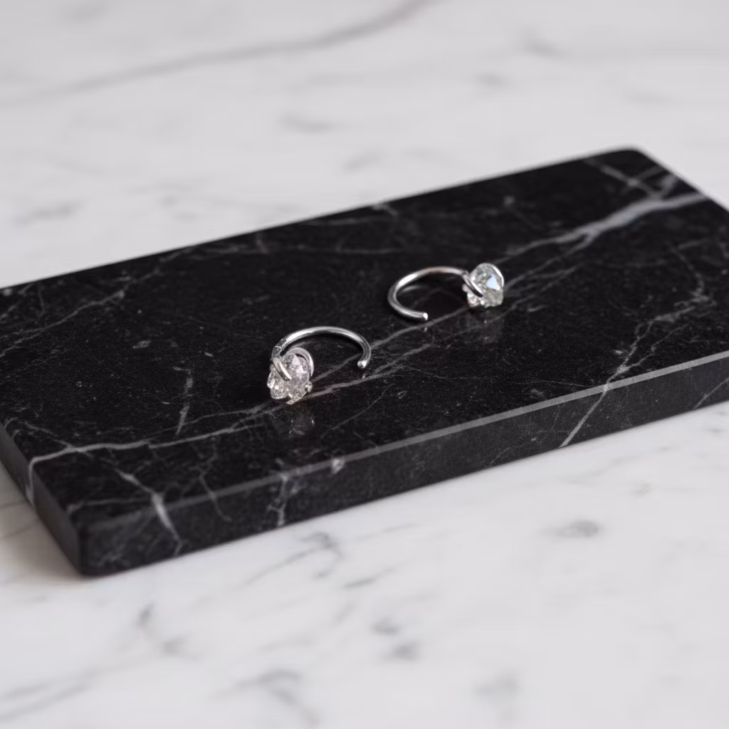 Silverörhängen rå rutilerad kvartskristall med koppar rutiler. Huggie örhängen med råa klara fina rutilkvarts kristaller som sitter fast i klor. Minimala örhängen i äkta silver med 3mm - 4mm små kristaller i mycket fin glänsande kvalitet. Moderna örhängen med grova kristaller.