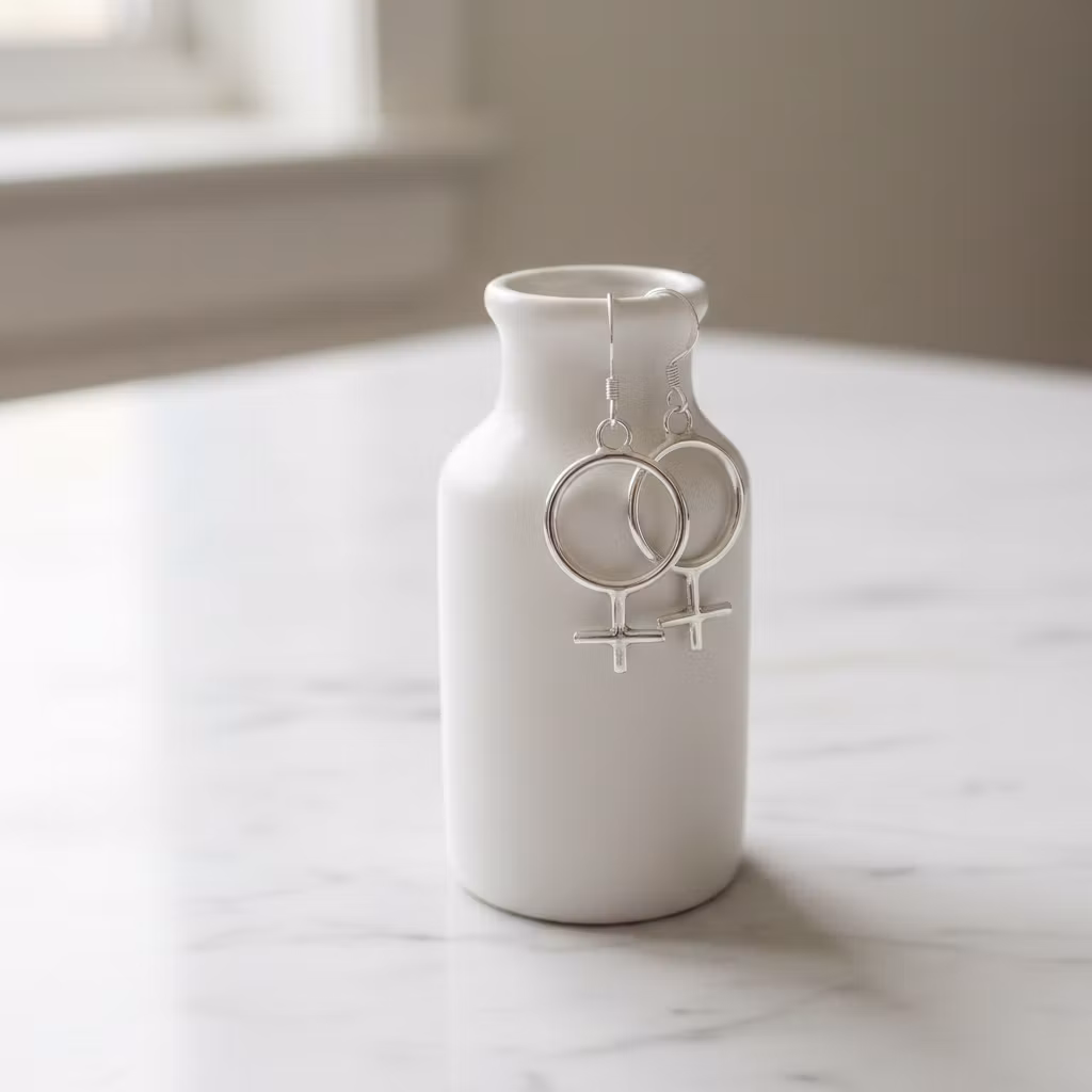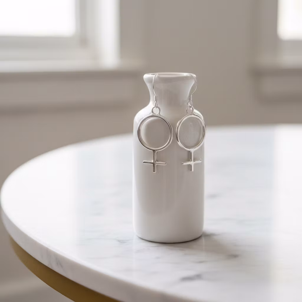 Äkta silverörhängen med symbol kvinna, Venus. Hängande örhängen med krokar och tidlösa skinande blanka kvinnosymboler i stilren design. Örhängena är skapade från återvunnet sterling silver. Hylla kvinnan med dessa Klassiska silverörhängen med Venussymboler. Perfekt som present! Polerduk medföljer.
