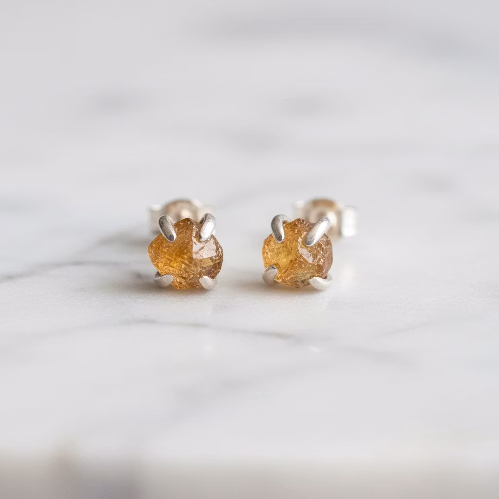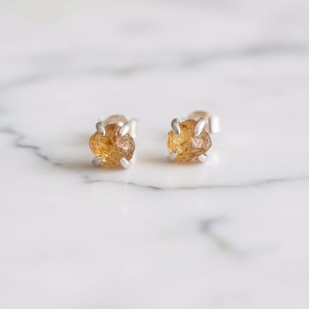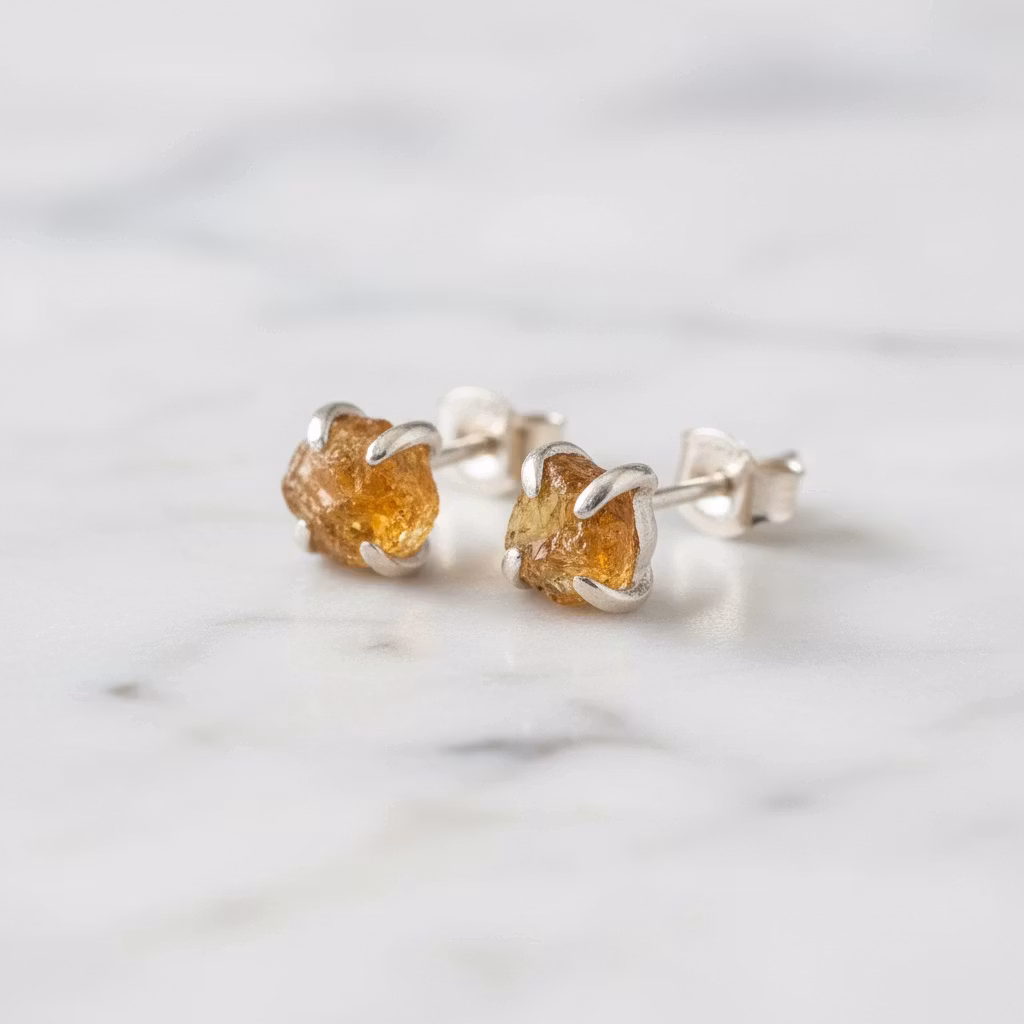 Silverörhängen med små råa naturliga citriner. Stiftörhängen med gyllene citrin stenar i mycket fin och glänsande kvalitet. Dom gula kristallerna sitter fast i klor. Månadsstensörhängen november. Gyllengula kristall örhängen med skimrande vackra citriner.