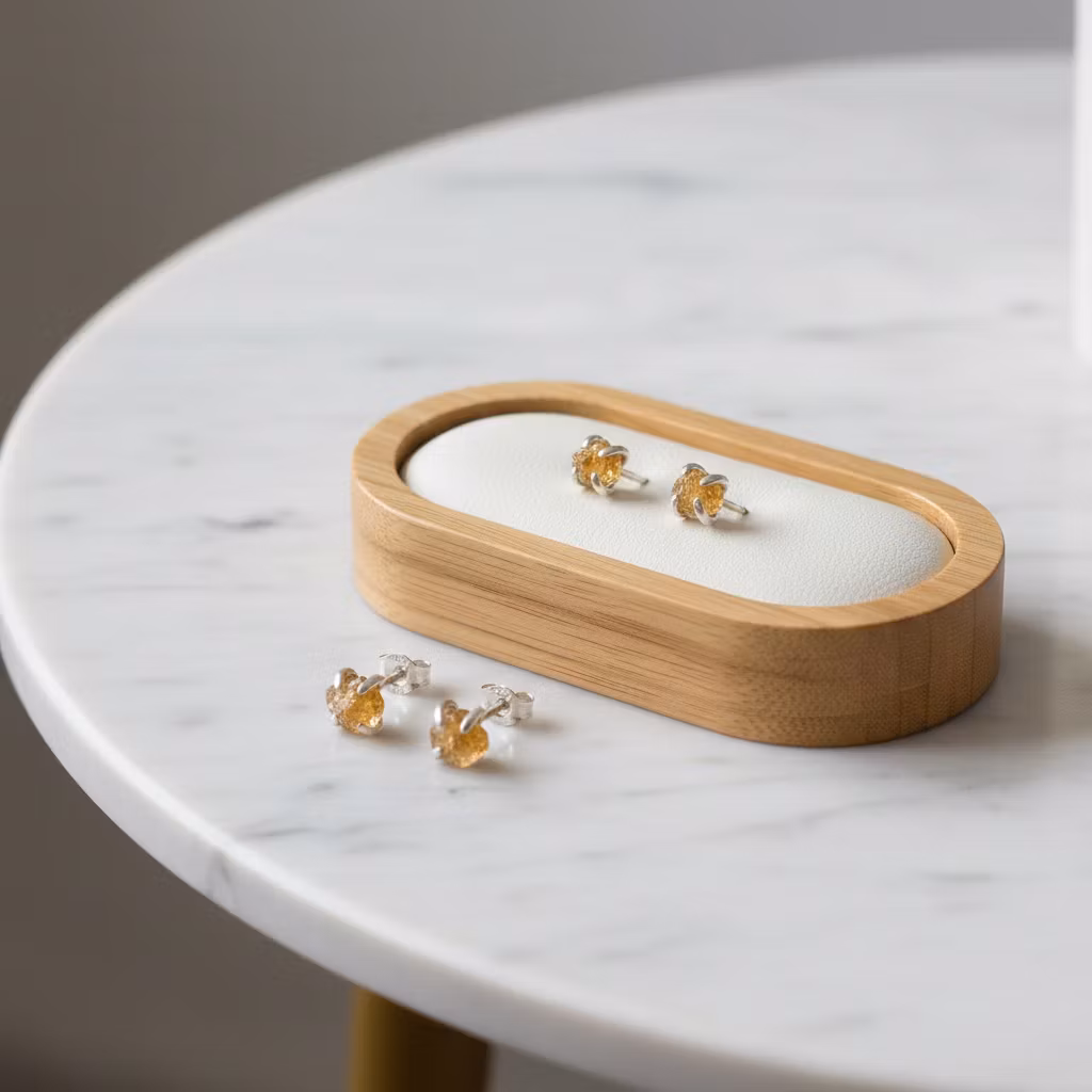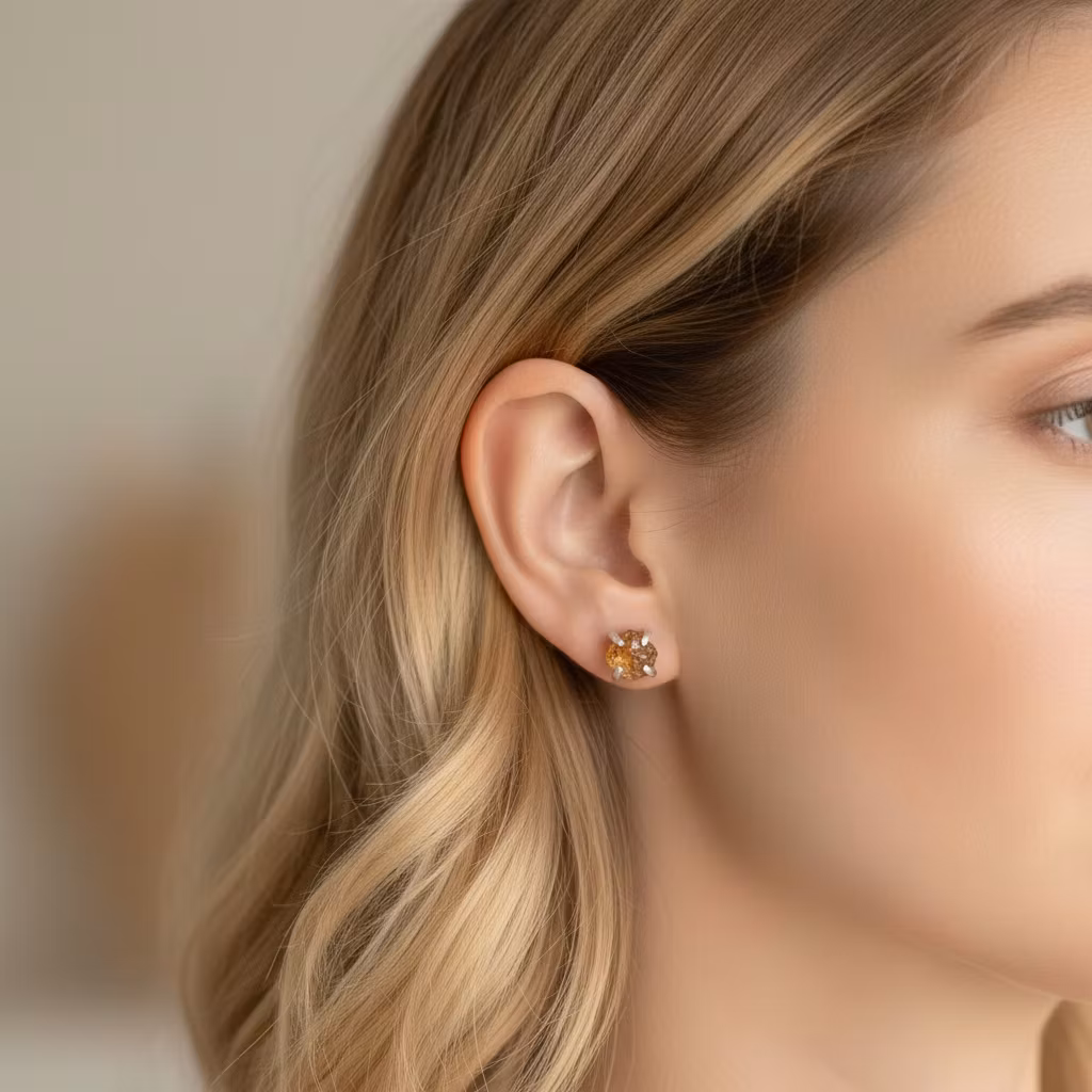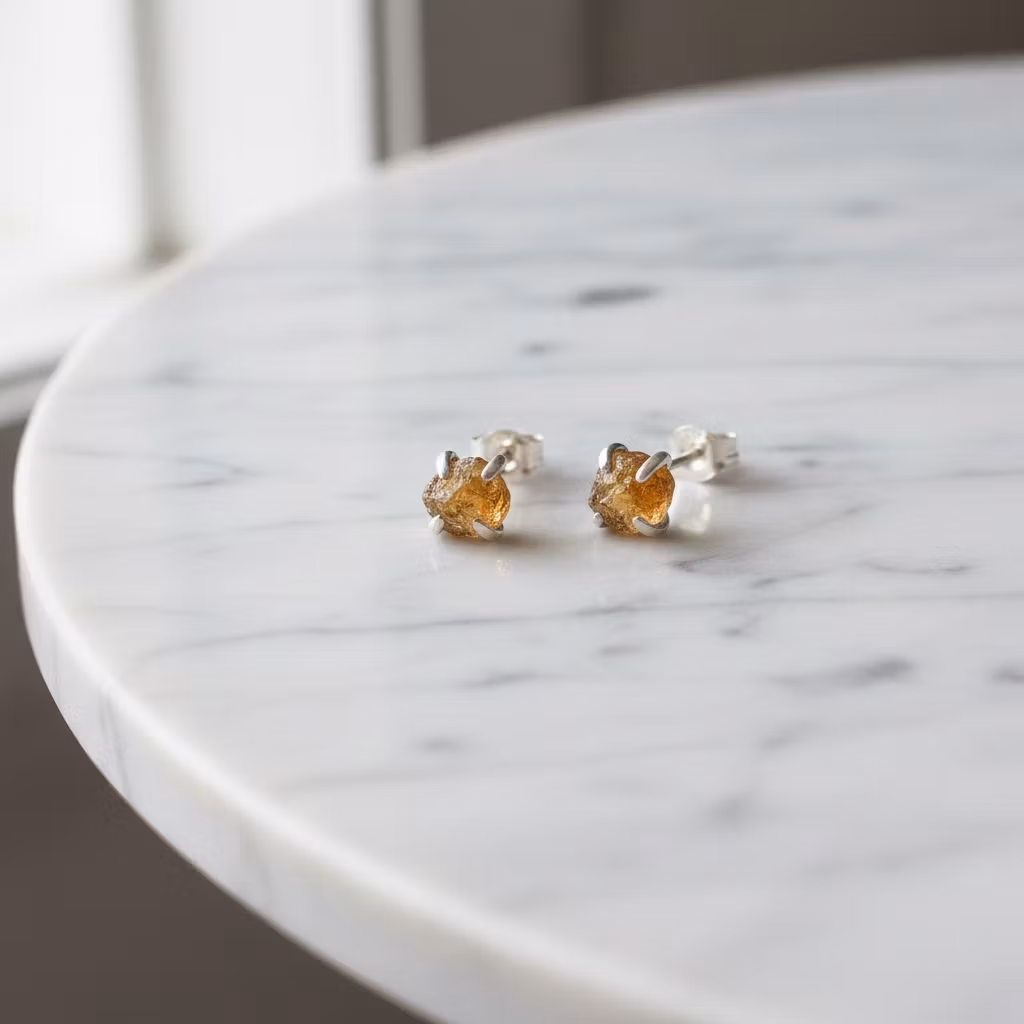 Silverörhängen med små råa naturliga citriner. Stiftörhängen med gyllene citrin stenar i mycket fin och glänsande kvalitet. Dom gula kristallerna sitter fast i klor. Månadsstensörhängen november. Gyllengula kristall örhängen med skimrande vackra citriner.