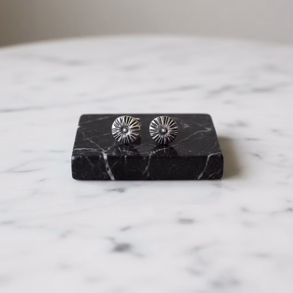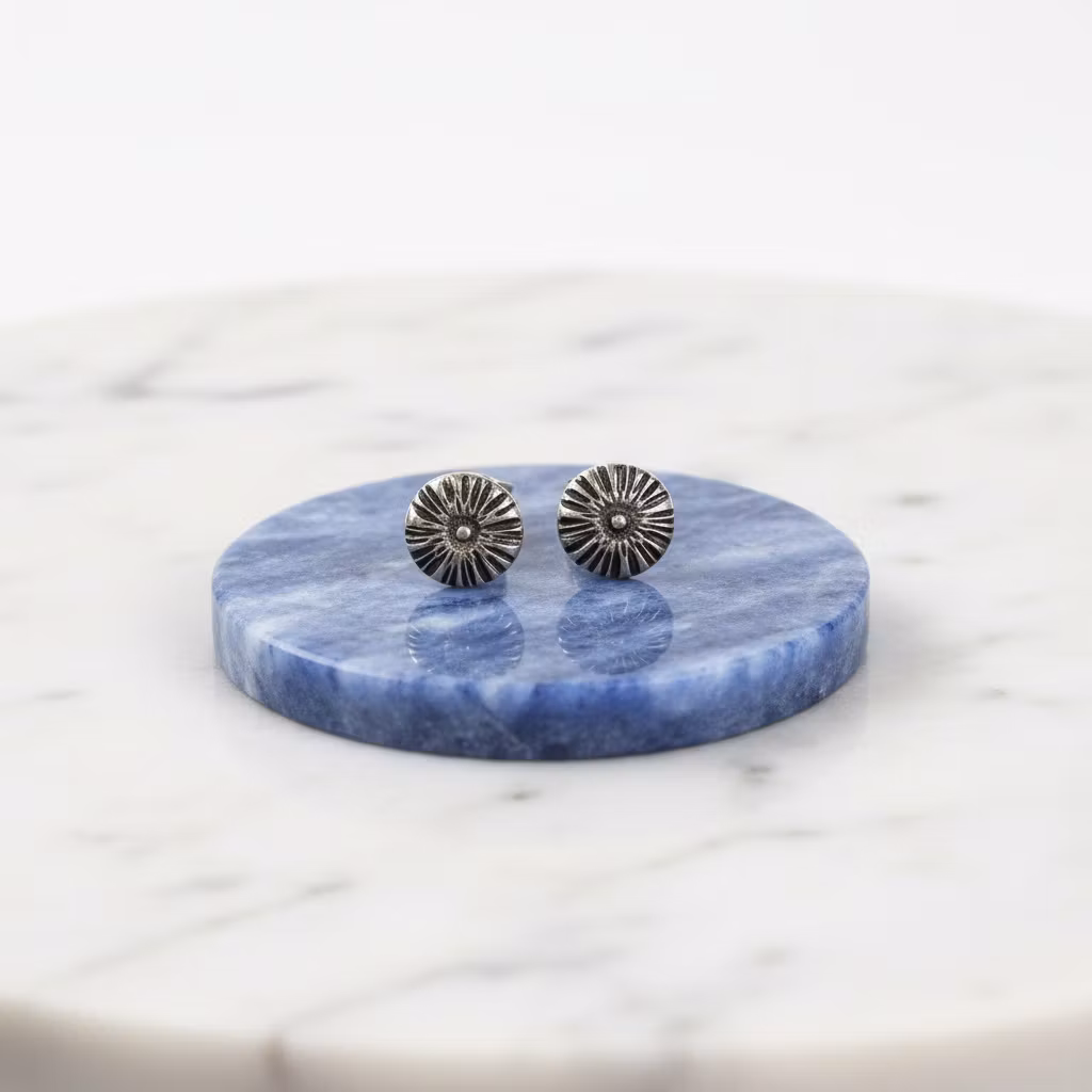 Äkta silverörhängen med små runda blommor med stift för hål i öronen. Mönstrade blomörhängen skapade från återvunnet sterling silver. Välj mellan oxiderade örhängen i patina eller örhängen i ljust silver. Små söta unika studsörhängen som passar för alla tillfällen. Polerduk medföljer.