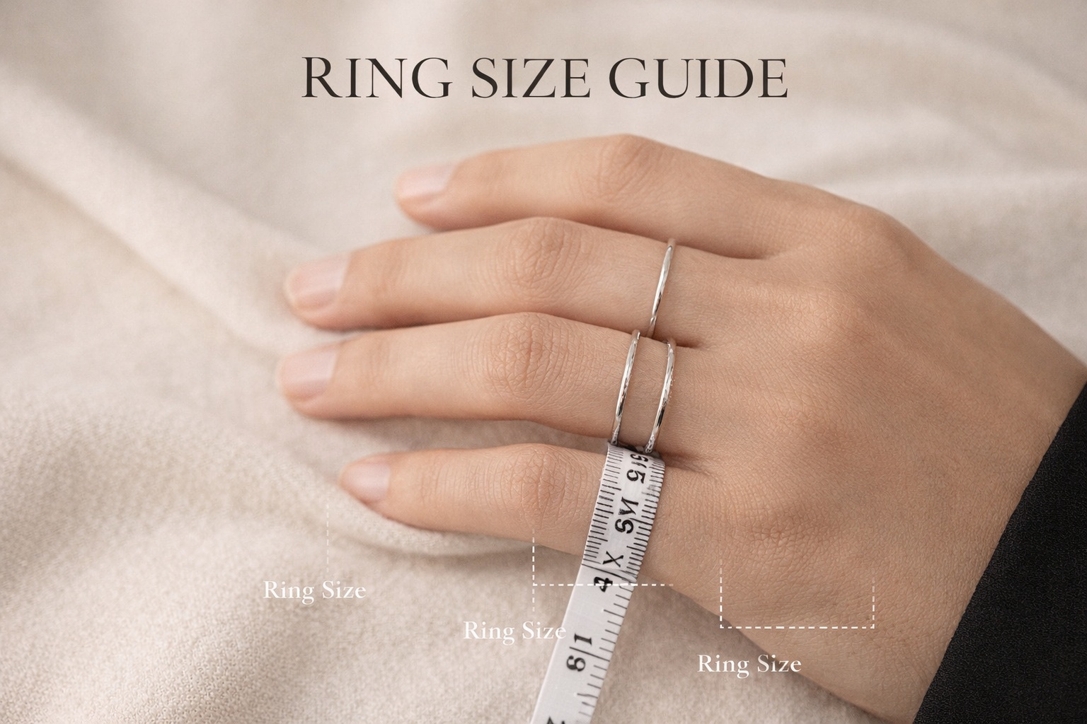 Lägg måttbandet på det finger där ringen ska sitta och mät noga hur många millimeter det blir. Detta är din ringstorlek i millimetermått. Mät noga flera gånger så det blir rätt storlek. Var noga med att kontrollera så att måttbandet även kommer över knogen på fingret. Om du inte har måttband hemma så fungerar det bra med ett snöre eller pappersremsa som du sen mäter hur många millimeter den är med en linjal.