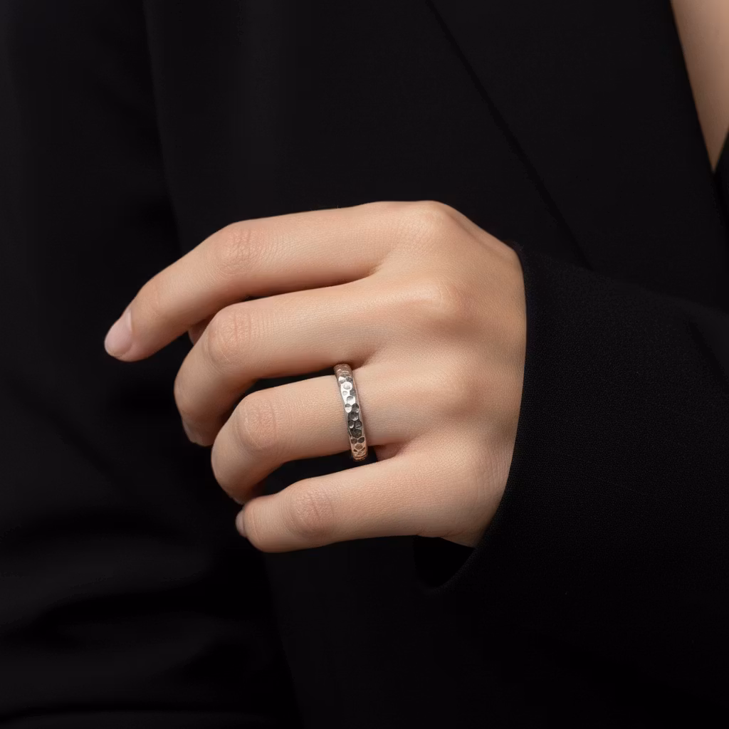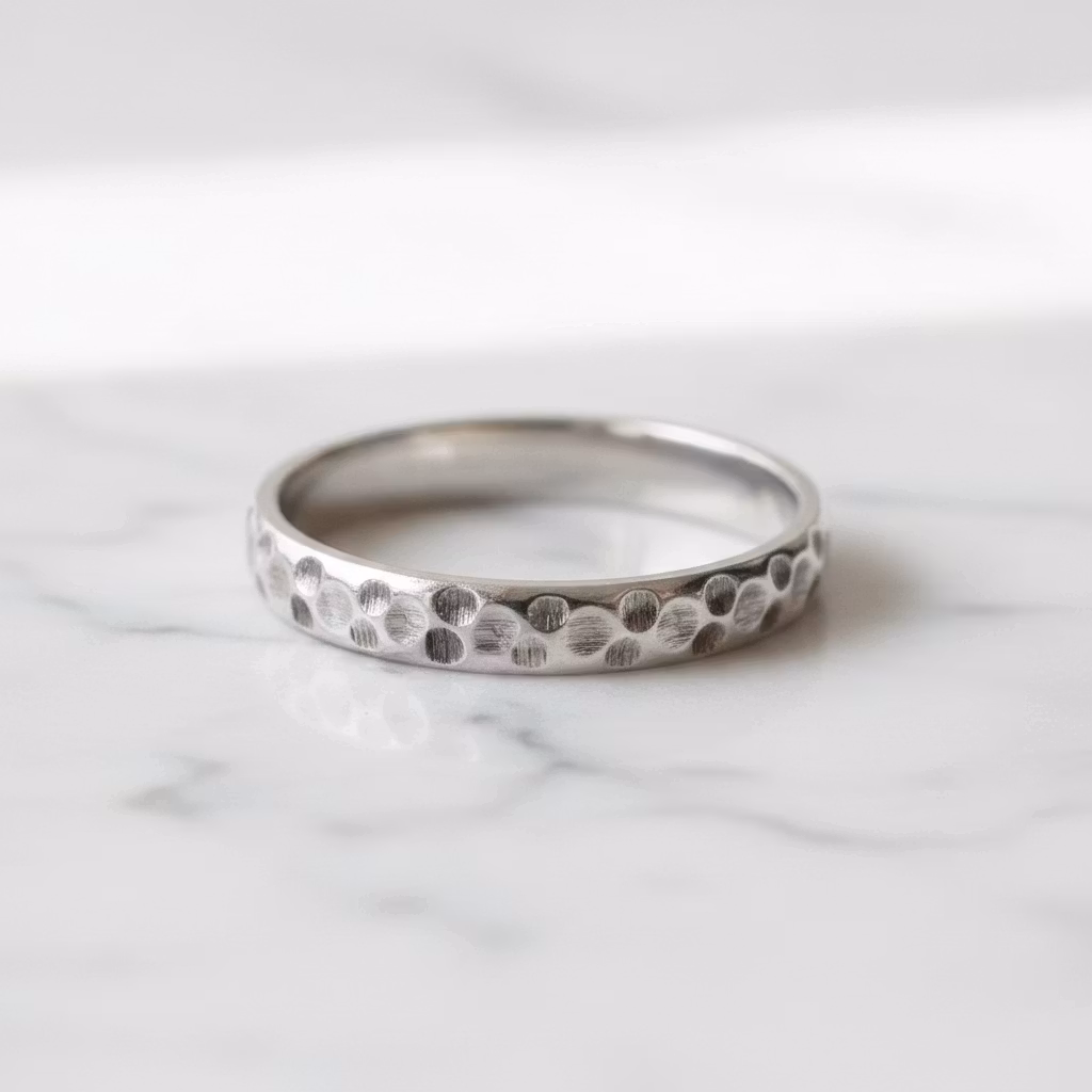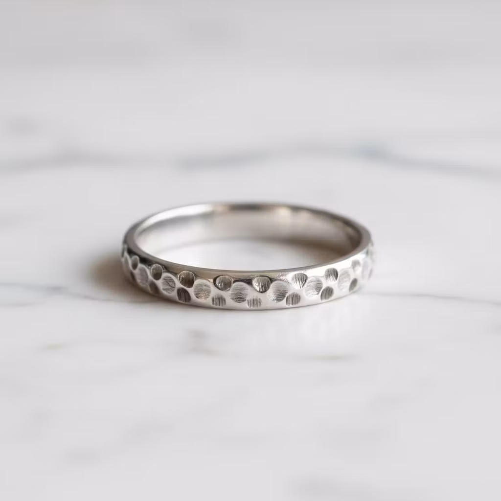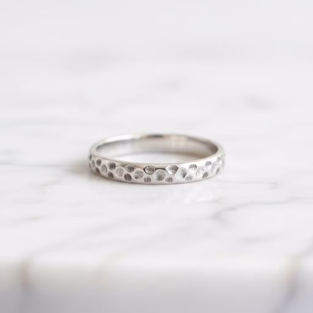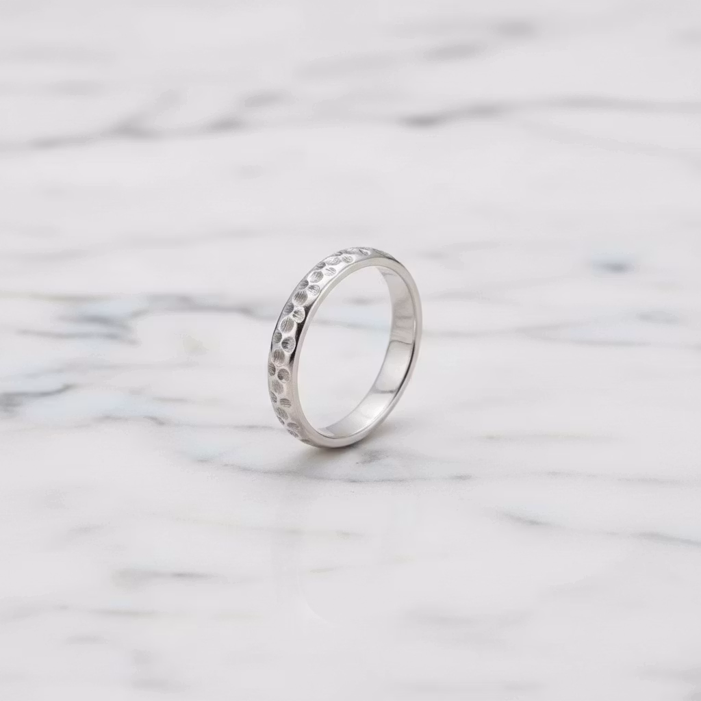 Mönstrad ring i äkta silver med en bredd på 4mm. Ringen är halvrund i formen och har en fräst yta. Elegant ring med snyggt ihåligt mönster som glittrar fint. Ringen är skapad av återvunnet sterling silver. Polerduk medföljer.