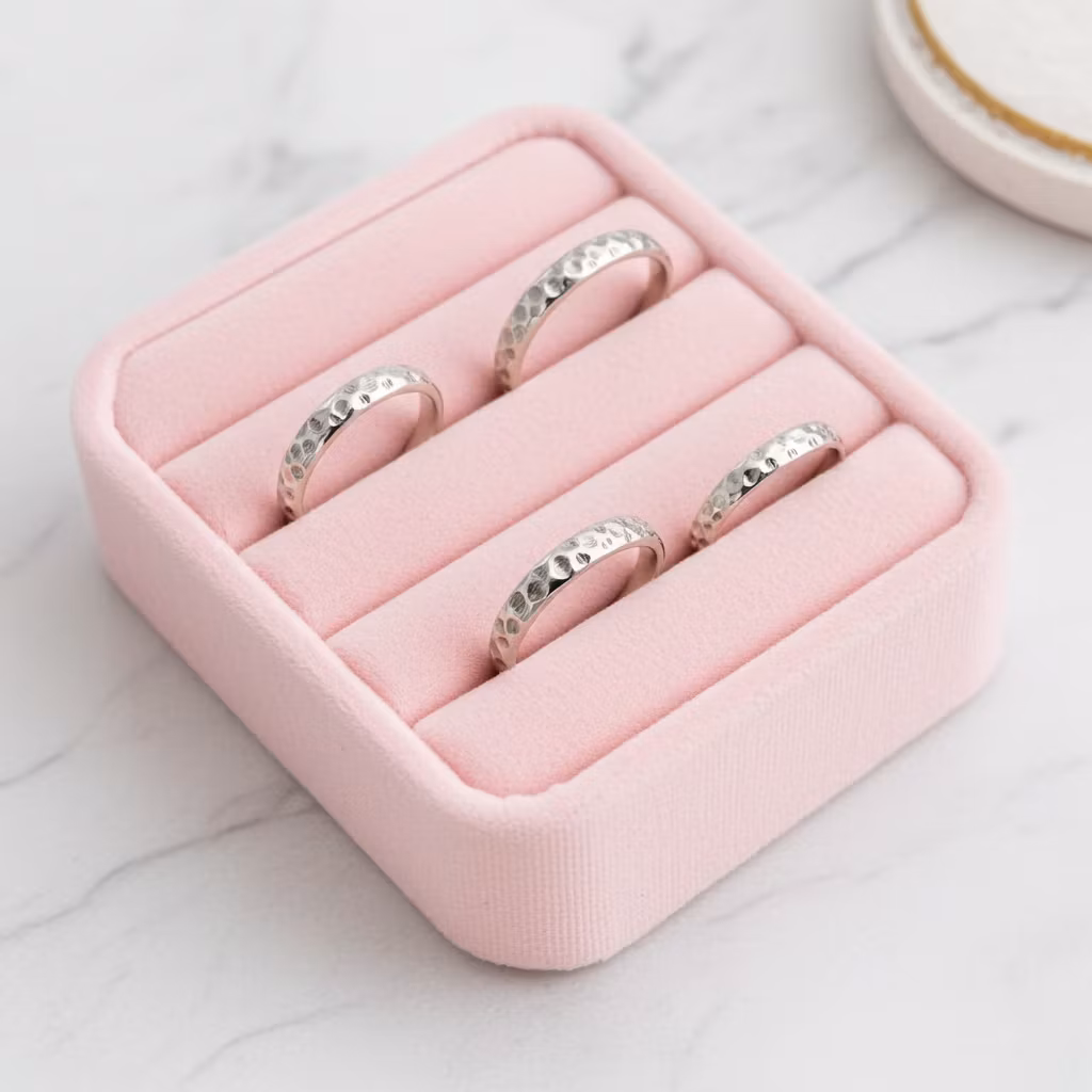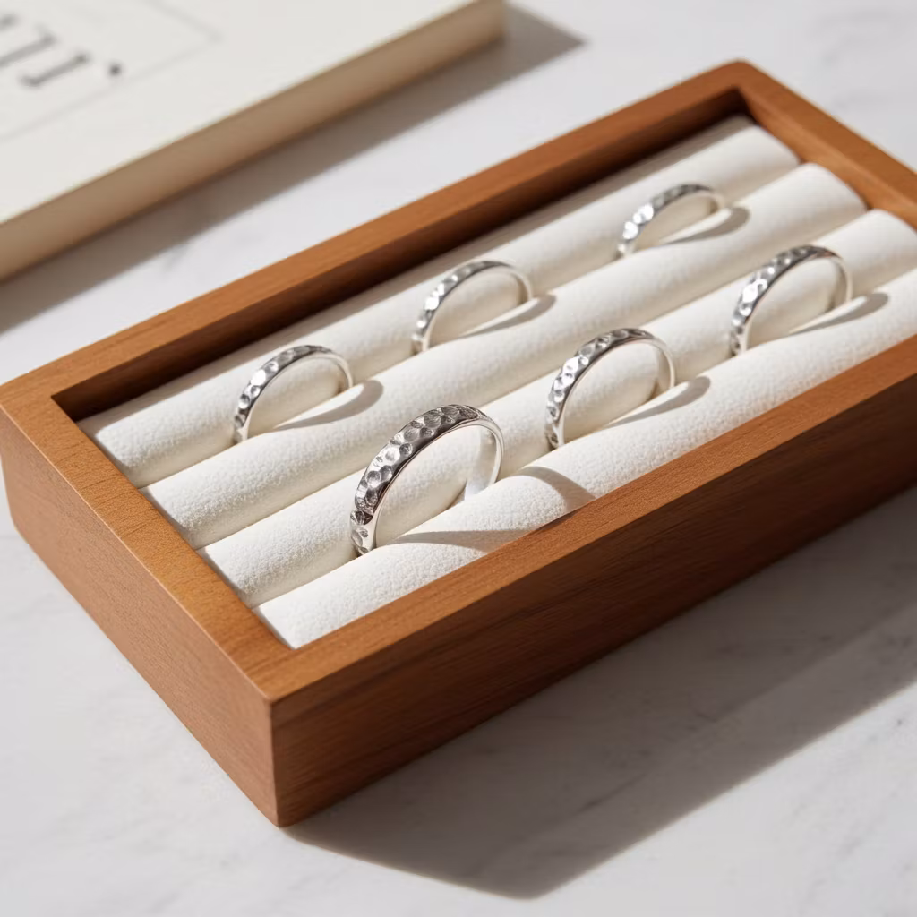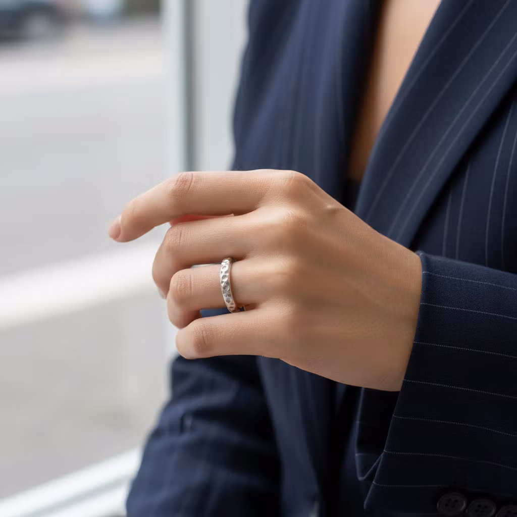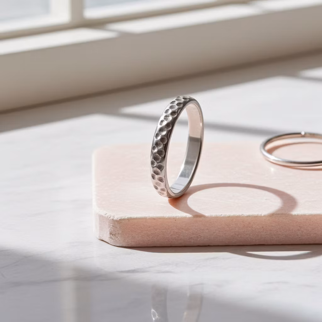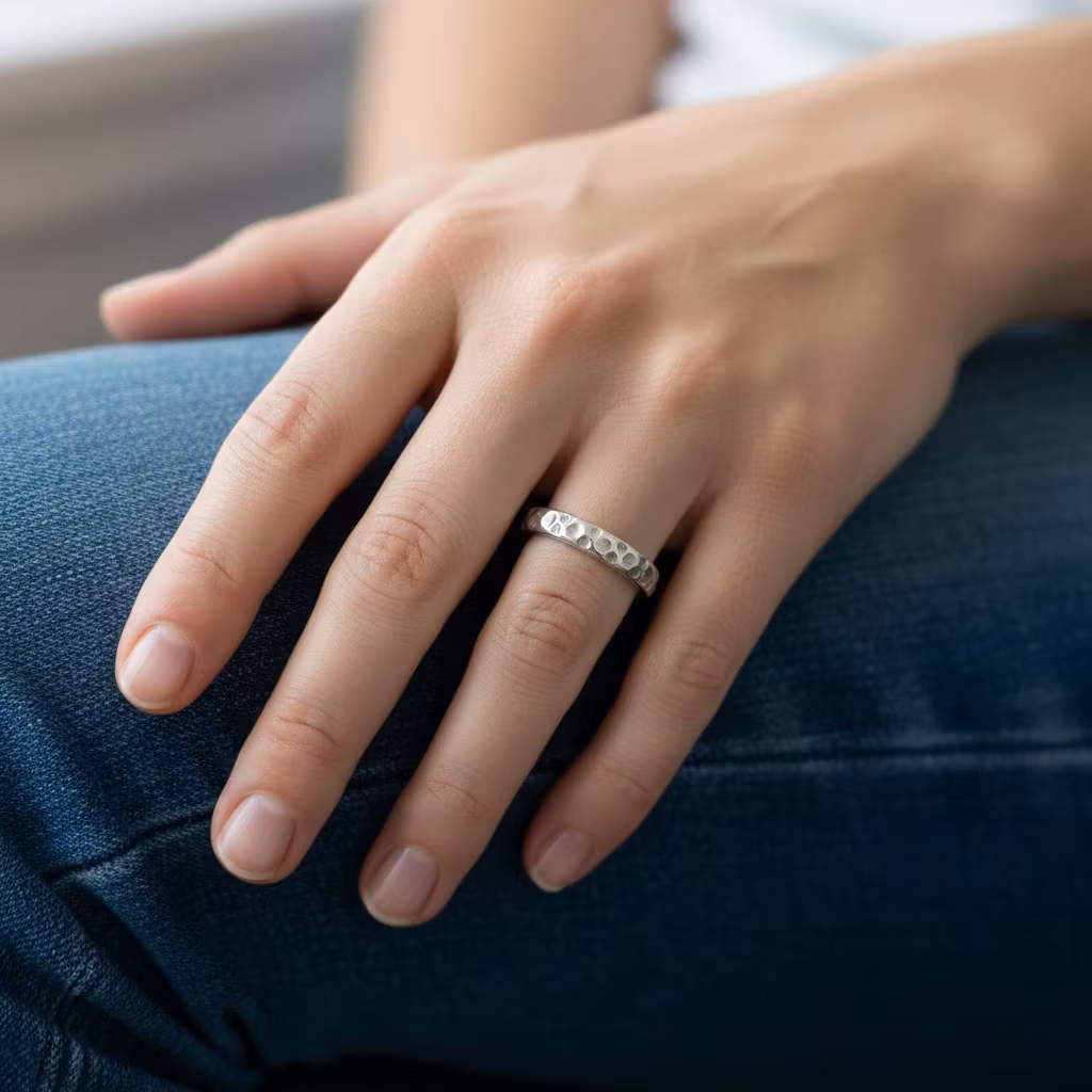 Mönstrad ring i äkta silver med en bredd på 4mm. Ringen är halvrund i formen och har en fräst yta. Elegant ring med snyggt ihåligt mönster som glittrar fint. Ringen är skapad av återvunnet sterling silver. Polerduk medföljer.
