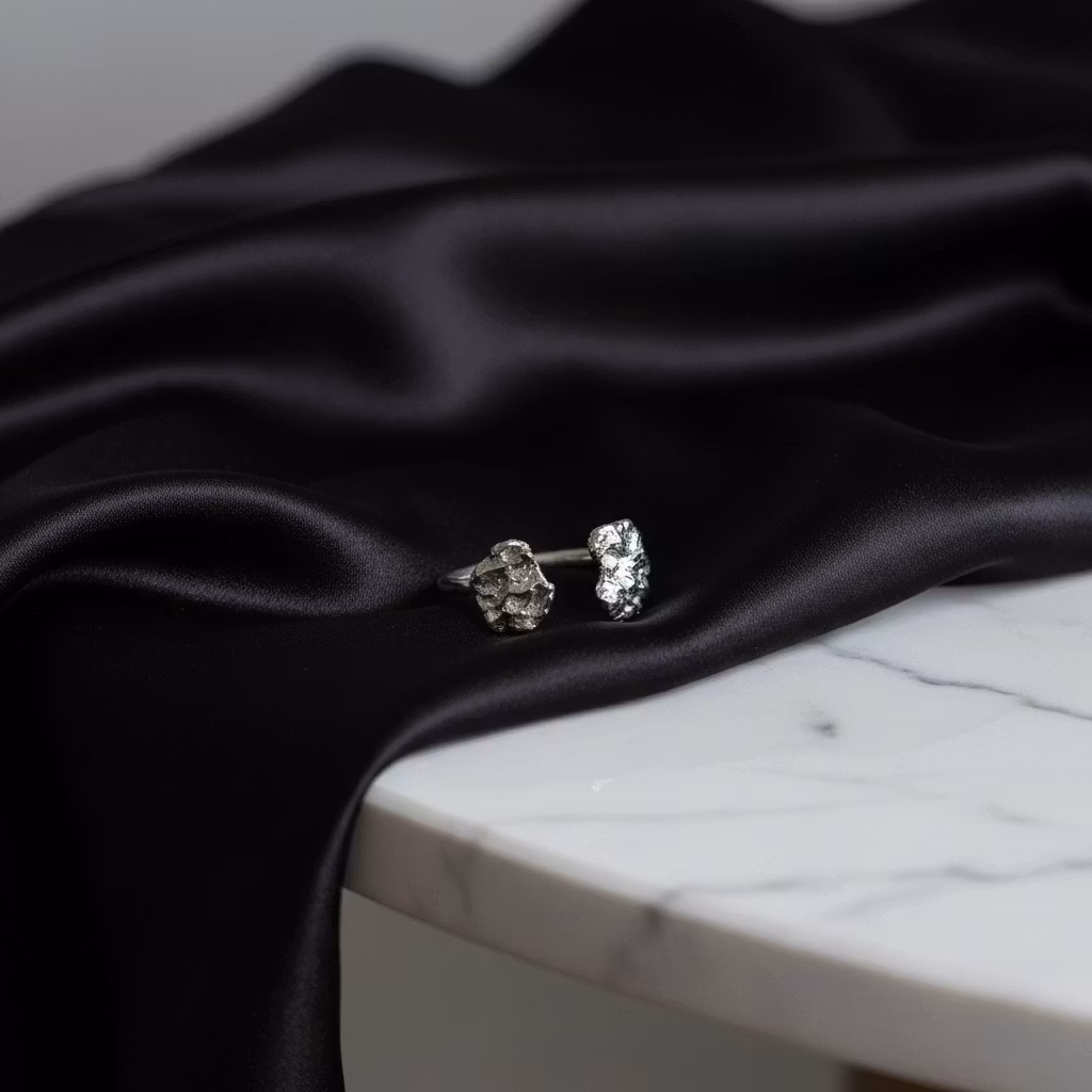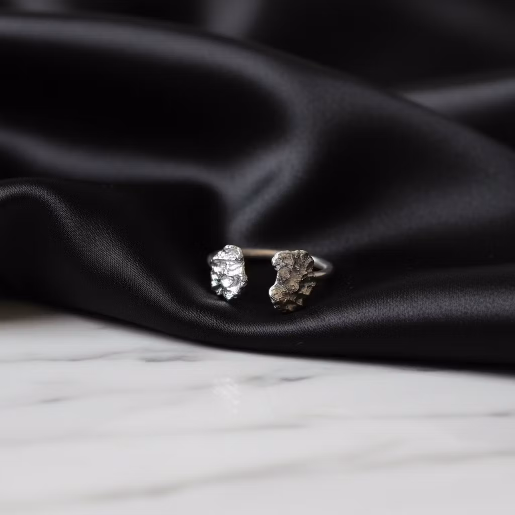 Öppen rustik silverring med nuggets skapade av smält återvunnet silver. Ringen är tillverkad av äkta silver med ca 10mm - 12mm nugget i organiska former. Varje ring är unik då ringen är handgjord. Silverring i modern design. Polerduk medföljer.