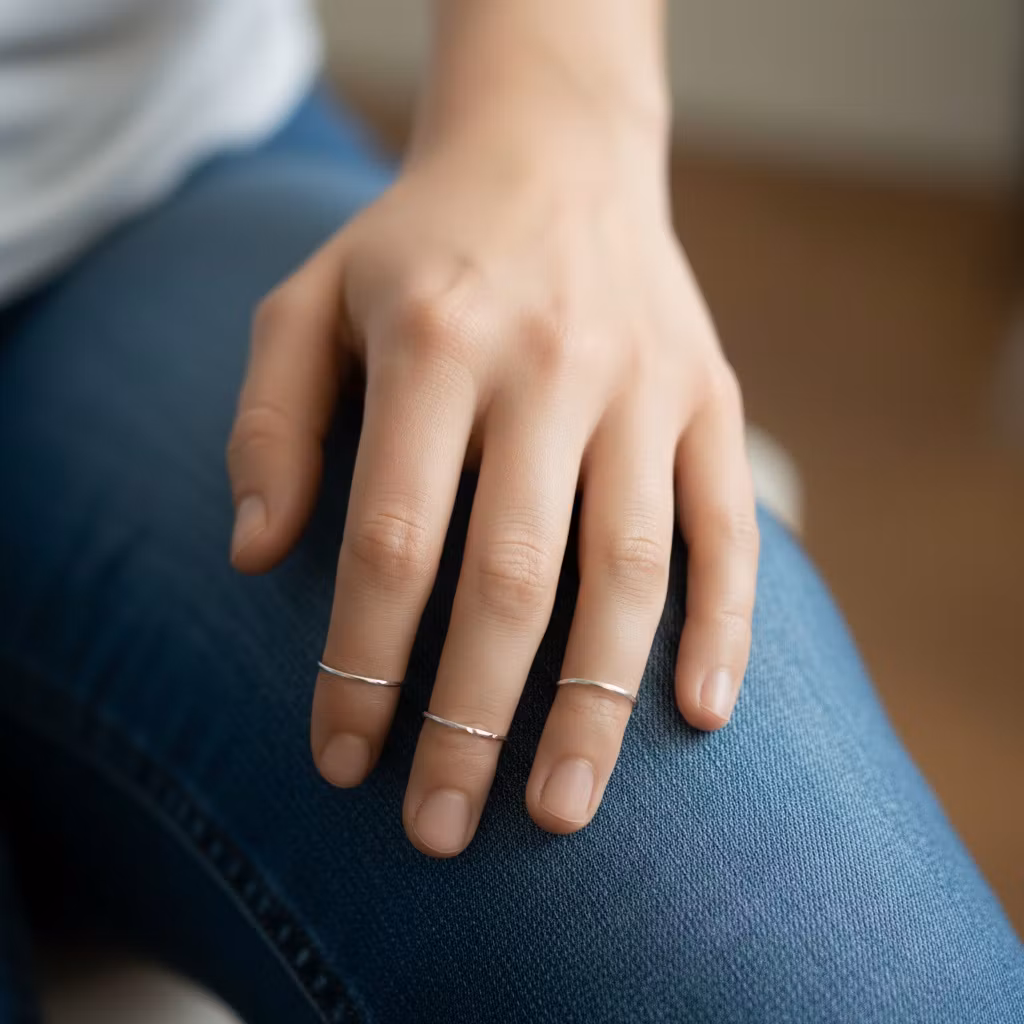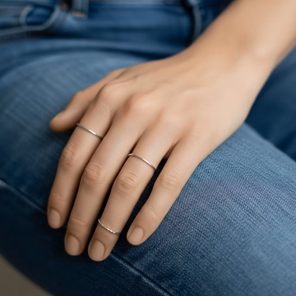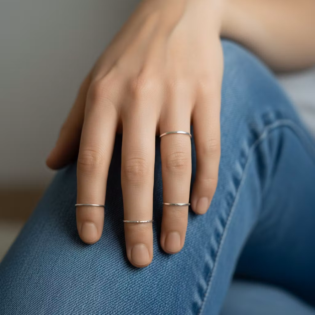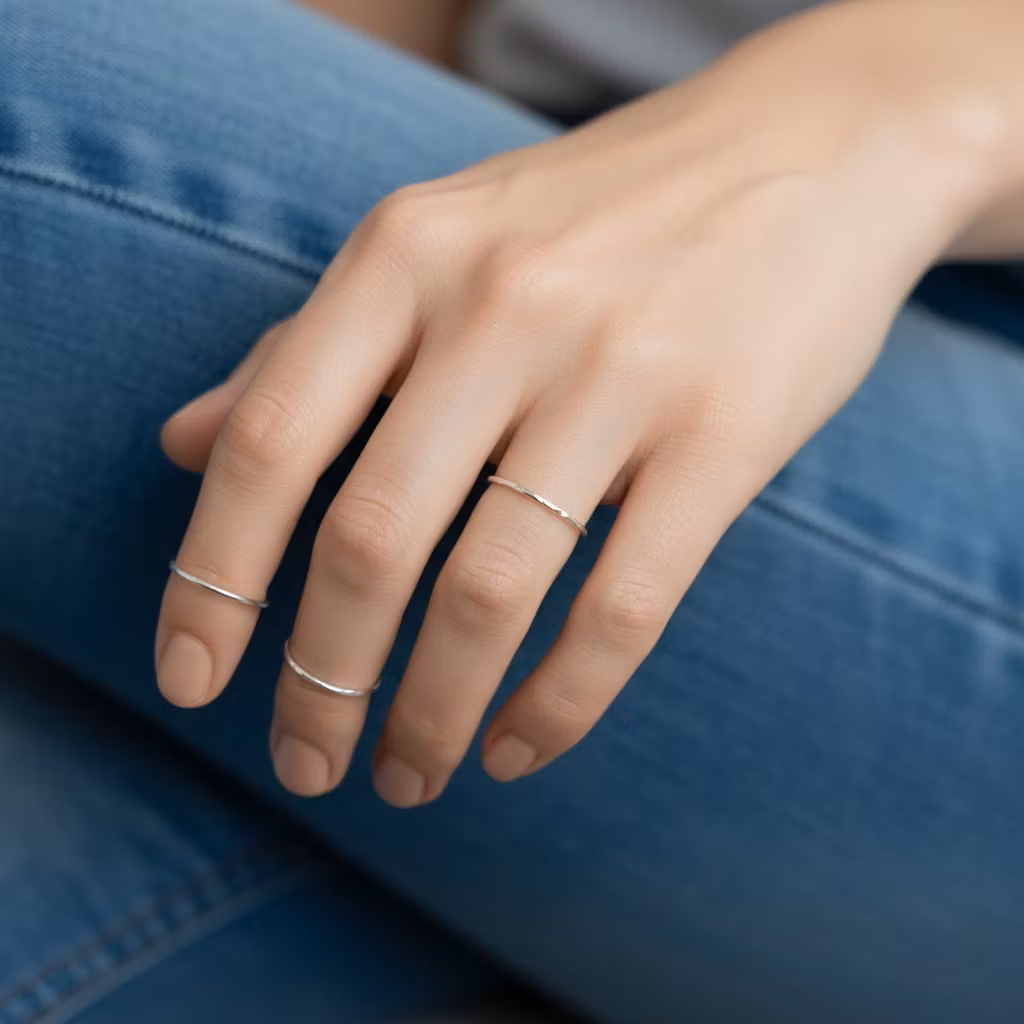 3-pack smala ringar i modell midi. knogringar eller fingertopsringar som dom också kallas för, är tillverkade i äkta silver och har olika ytor. 2 stycken mönstrade ringar och 1 styck slät ring. Ringarna har en bredd och tjocklek på 1mm och är tillverkade från återvunnet sterling silver. Fingertopsringarna har en mindre storlek då dom ska sitta ovanför knogen. Ringarna är snygga att kombinera med vanliga ringar. Polerduk medföljer.