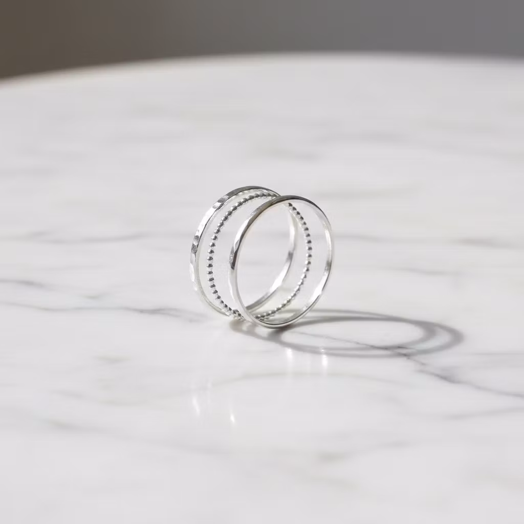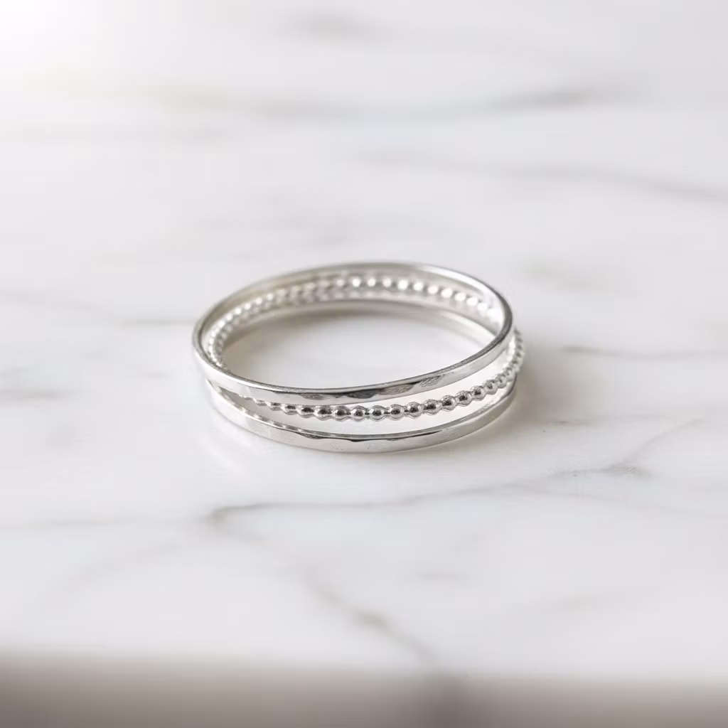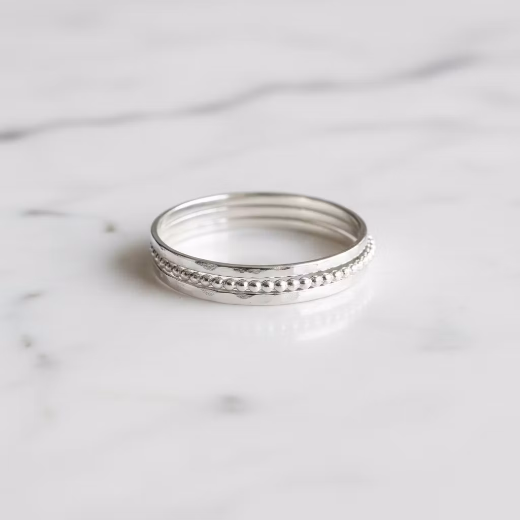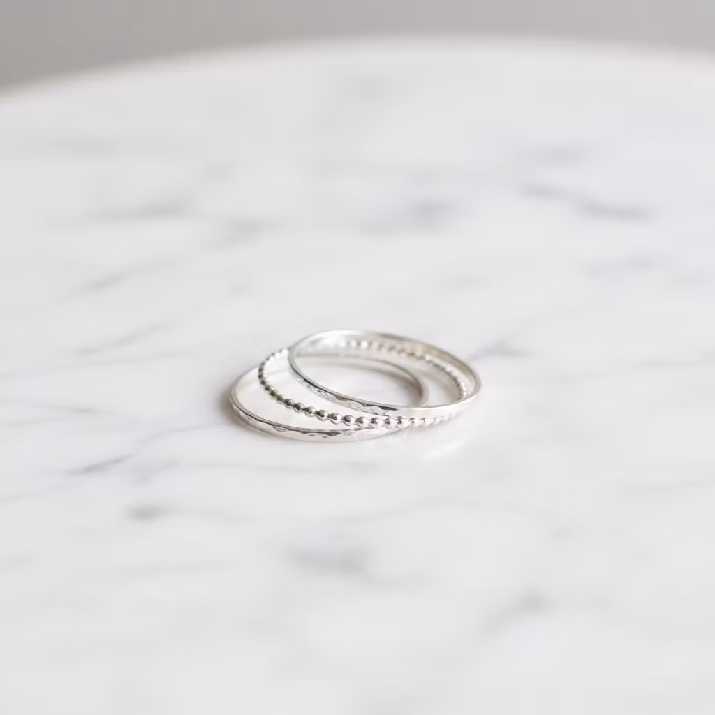 3-pack smala silverringar av sterling silver. Setet innehåller 2 stycken hamrade ringar och 1st kulring i glänsande silver. Ringarna är 1mm breda. Snyggt set med smala ringar tillverkade i äkta silver. Dom tunna ringarna passar utmärkt för en minimalistisk stil. Polerduk medföljer.