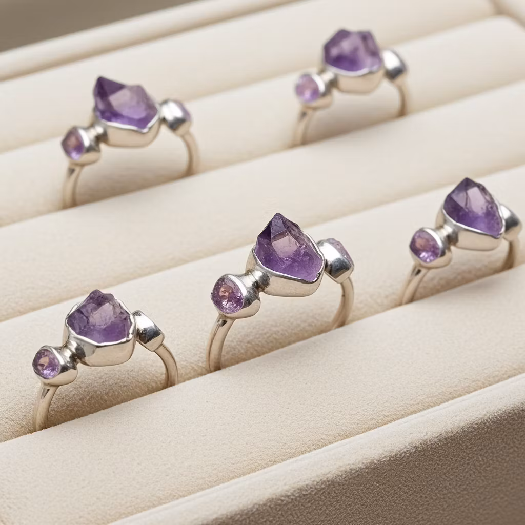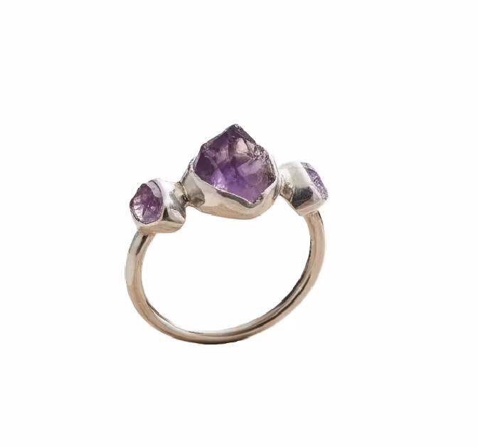 Lila kristallring i äkta silver med tre stycken glänsande vackra ametister på rad. En vacker trestensring med oslipade ametist stenar i mycket fin kvalitet. Stenarna är från 4mm - 8mm. Ringen har en slät yta och har en bredd och tjocklek på 2mm. Stenarna ligger mot en öppen baksida så att ljuset glänser fint igenom. Alla ringar är unika då kristallerna är äkta naturliga. Polerduk medföljer.
