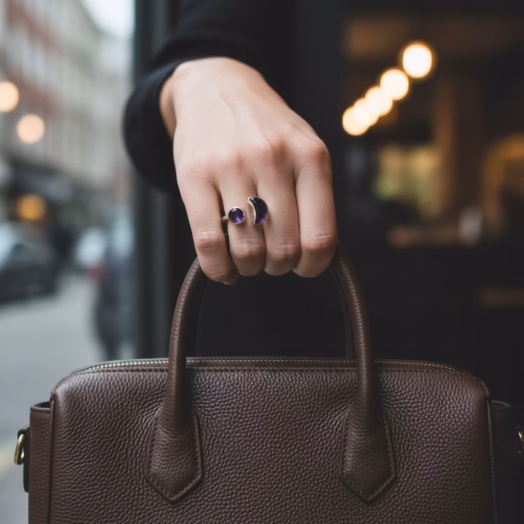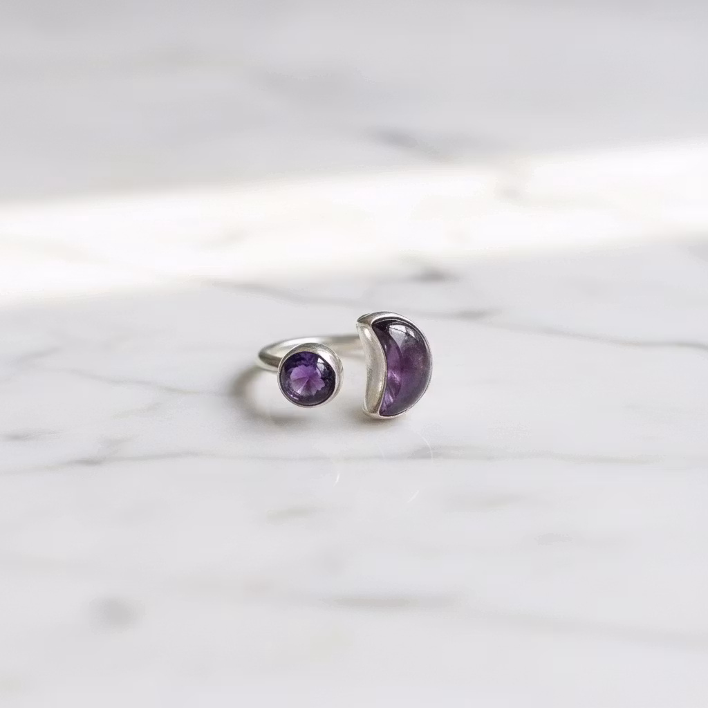 Öppen silverring med ametist halvmåne och rund ametist sten i form av en fullmåne. Hel- och halvmåne ring med ametist stenar i fin kvalitet. Ringen är 2mm tjock med 10mm halvmåne och 6mm fullmåne. Ametistringen är skapad av äkta silver med månadsstenar februari. Galaktisk silverring. Polerduk medföljer.