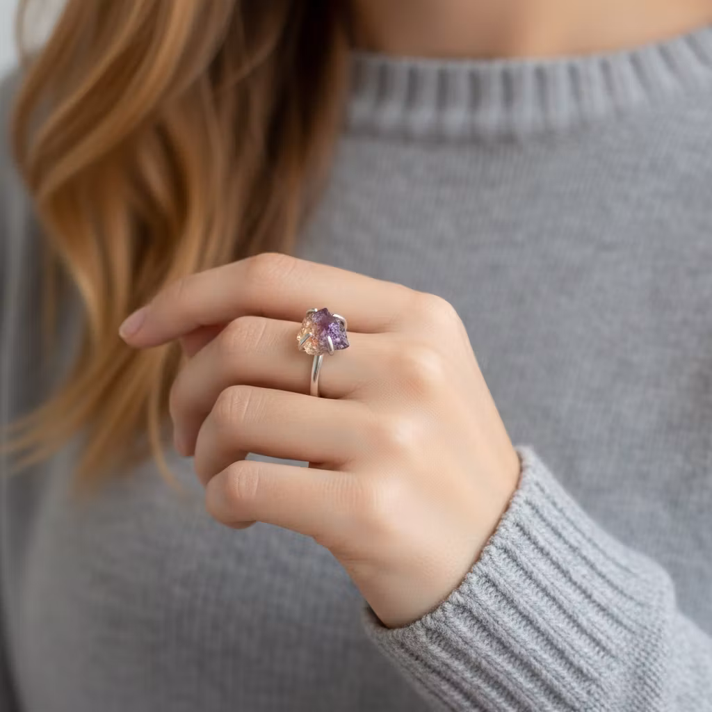 Silverring med rå ametrin sten i klofattning. Slät ring i äkta silver med rå naturlig ametrin kristall. Stenen är mellan 6mm - 8mm stor. Ametrinerna är unika och skiljer sig lite åt i form, mått, tjocklek och nyans. Alla stenar är precis lika fina och innehåller både lila och gult. Ametrin är en kristall som består av både ametist och citrin, perfekt som både februari och november månadssten. Polerduk medföljer.